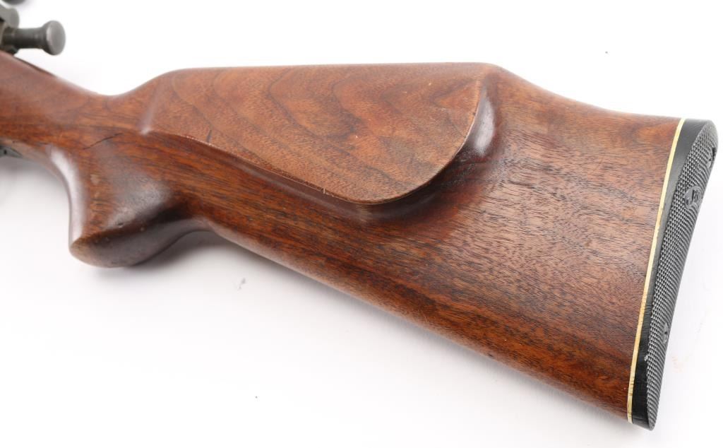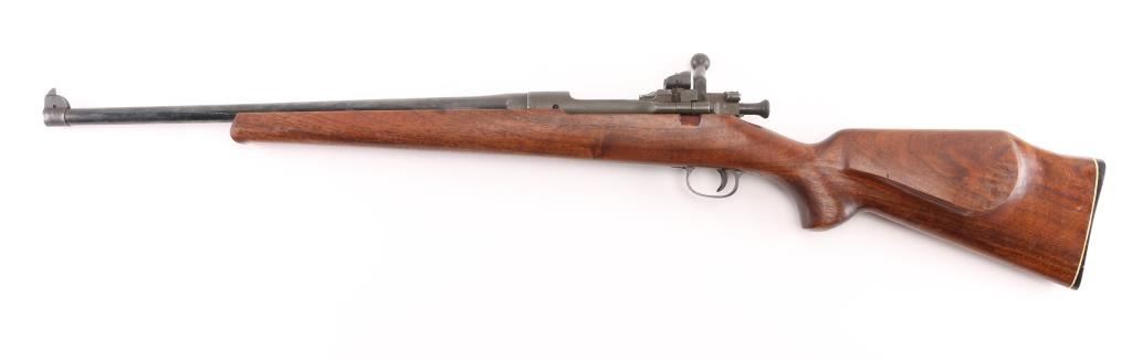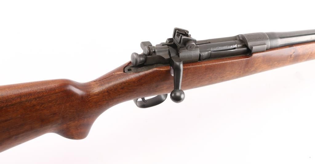 WW2 U.S. Military issued bolt-action rifle that has been sporterized, barrel shortened to 20" and reblued. Parkerized receiver. hinged floorplate. Retains the original military sights, but the rear peep has been cut into a V-notch. Handguard removed, Restocked with a Bishop sporting stock, shadow line cheek piece. Bore appears very good/bright,. Wood is good overall with some handling loss, there is a chip/crack behind the tang. Action works well. NRA Condition-Good. C&R Firearm.