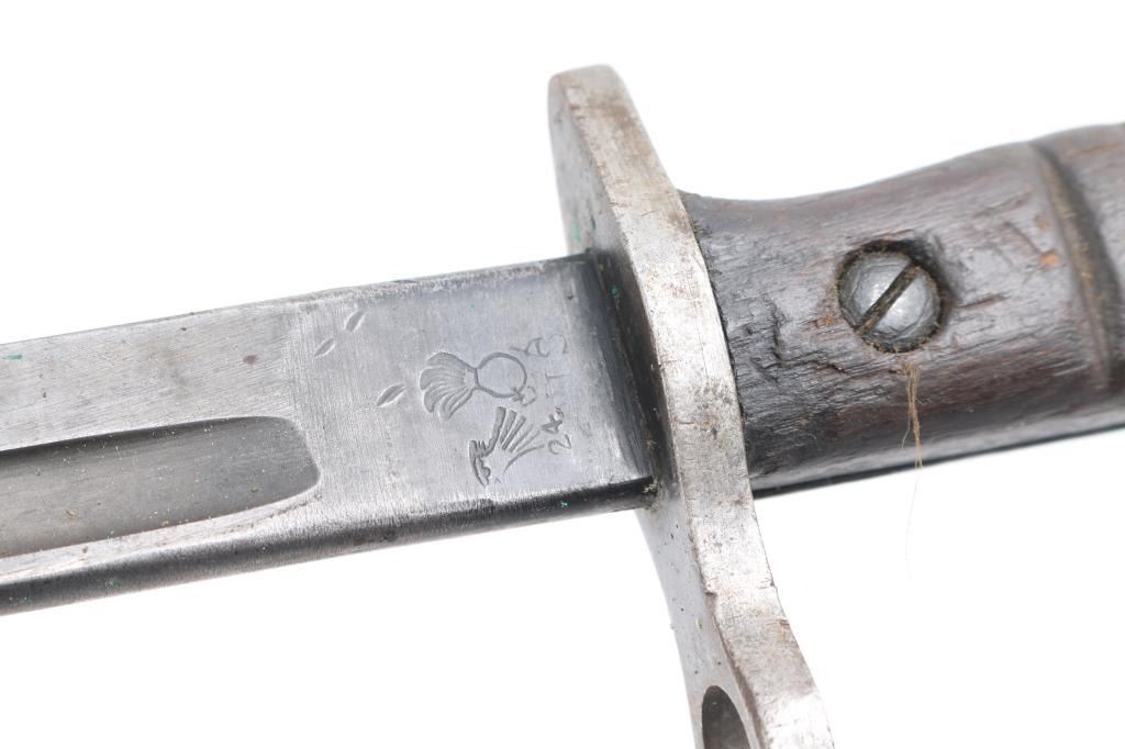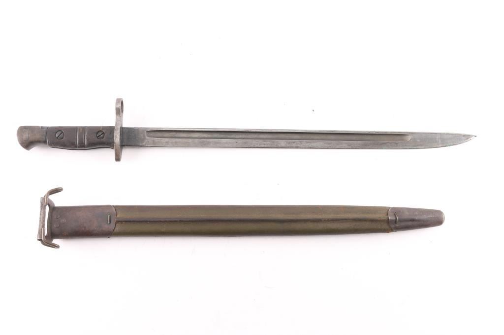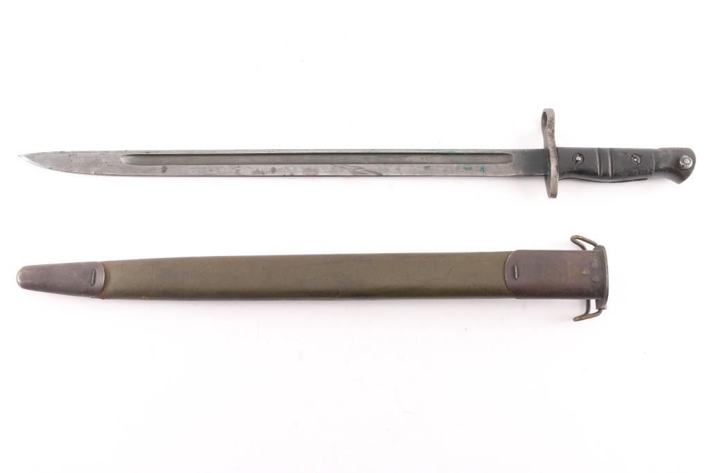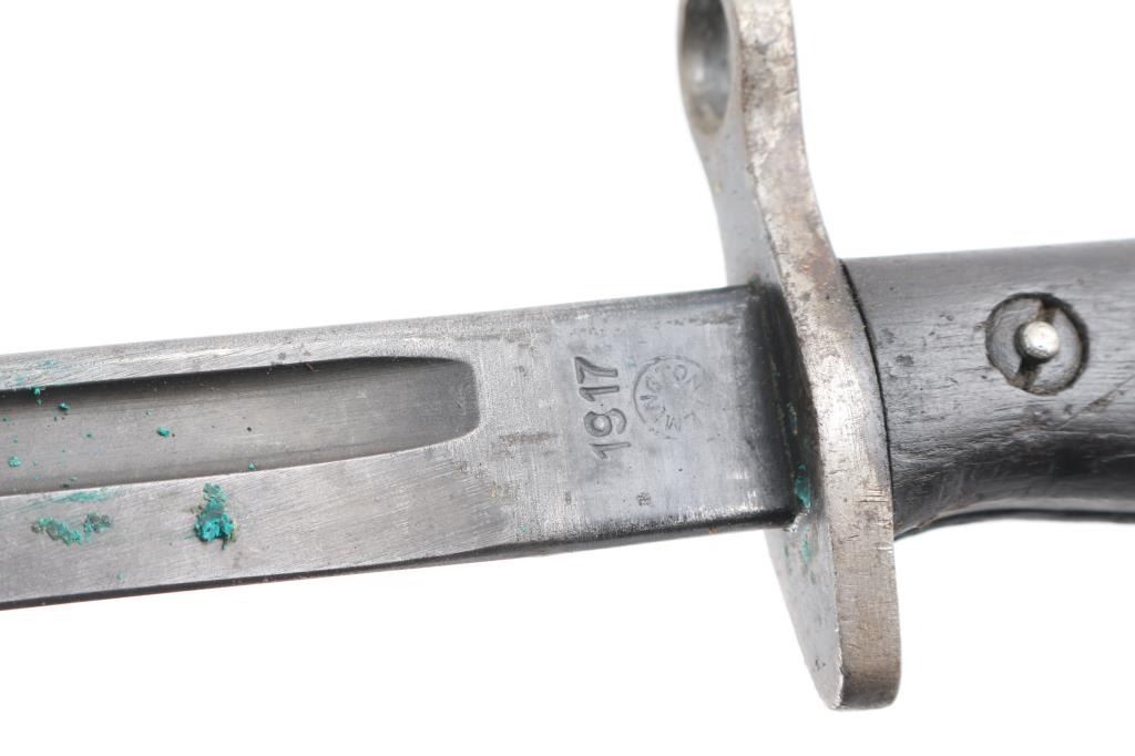 Very good condition bayonet with wood scales, 17" blade, 21.5" overall, black color on handle, gray colored blade, marked "1917", "REMINGTON", ordnance flaming bomb and "US", eagle 24 head stamp. Green leather scabbard has metal tip,metal throat marked "GF".