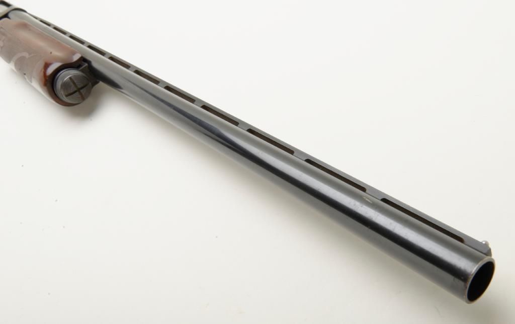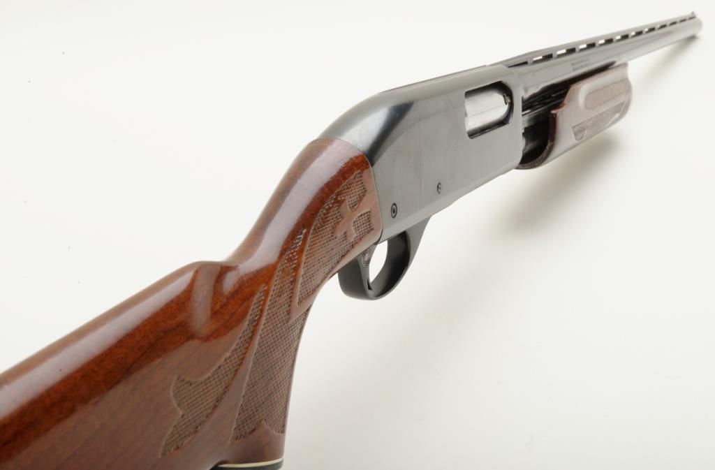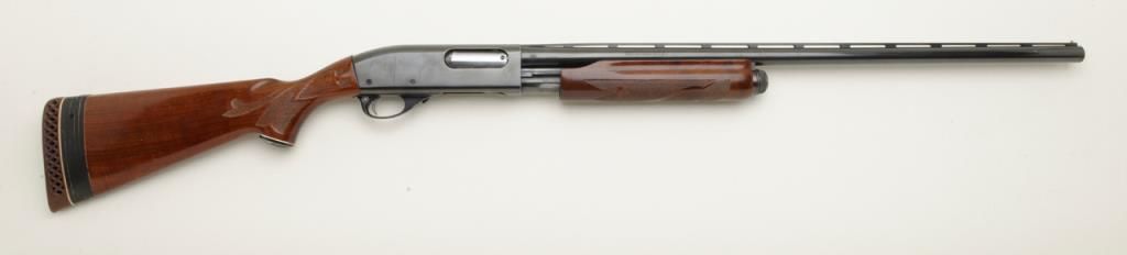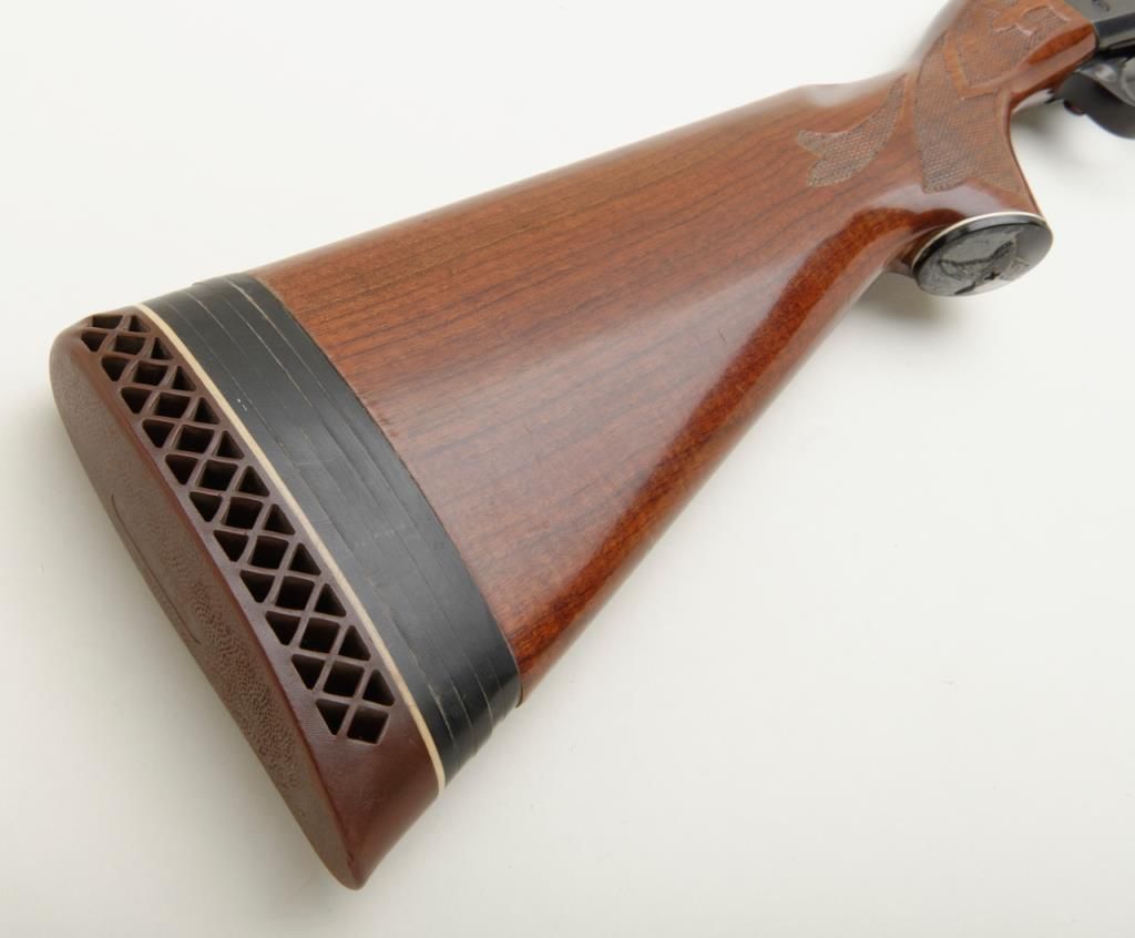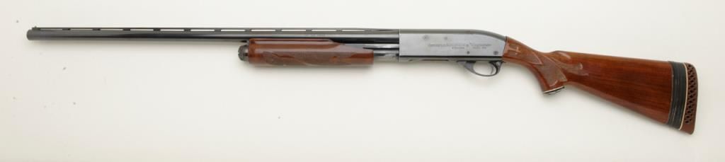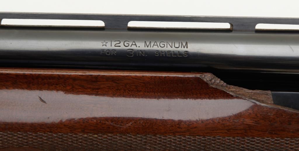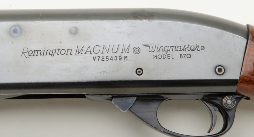 Remington Magnum Model 870 Wingmaster pump action shotgun, 12 gauge Magnum, modified choke, 28” ventilated rib barrel, blue finish, checkered wood stocks, #V725439M in overall very good to near fine condition showing the majority of its original finish, fine bore, crisp action and markings; very good wood with a number of spacers and White Line brown hard rubber butt pad. (Modern/PPT). Est.: $175-$350.