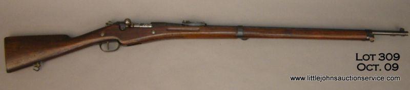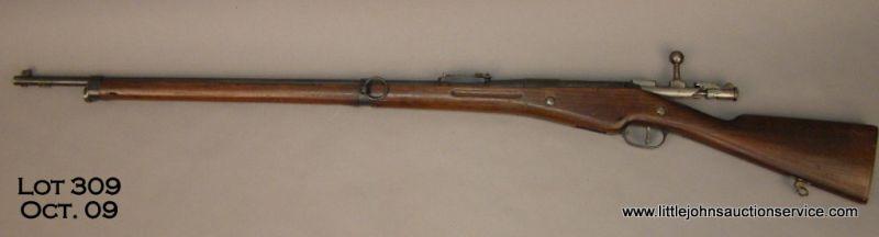 Remington-Mannlicher Berthier Model 1907/1915 bolt-action rifle NSNV. Made for the French gov’t from 1907-1915. Left side receiver marked “Remington M’LE 1907-15” 8mm Lebel caliber, 31.5” barrel marked “RAC 1907-15,” full-length stock,tangent sights. Excellent wood, finish and bore. Est. $350-$700.
