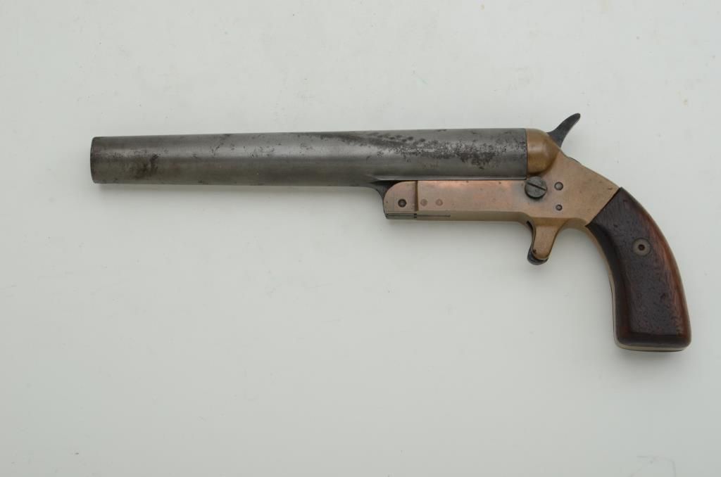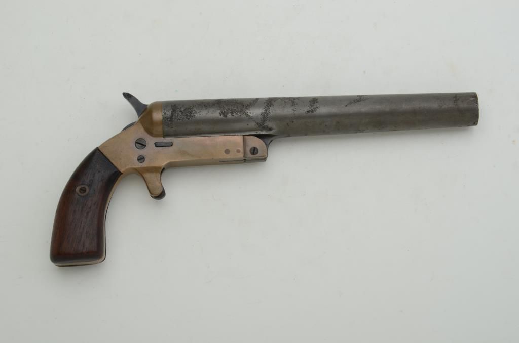 Remington Mark III flare pistol, brass frame, wood grips in overall good condition with scattered areas of erosion and pitting on barrel, good action, rough bore, good grips. Est. $75-$125.