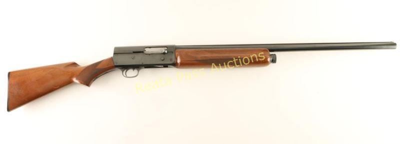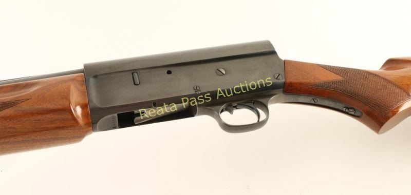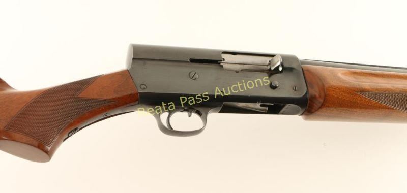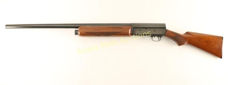 Vintage semi-automatic shotgun chambered for 2 3/4" 12 gauge shells, circa 1912. Features a blued refinish, 28" barrel with raised matted rib, silver bead front sight. 1/2 length tube magazine, suicide safety, smooth trigger, checkered charging handle, humpback steel receiver, checkered walnut beavertail forend and pistol grip shoulder stock with Bishop black hard rubber buttplate. Shotgun exhibits approximately 85% of it's older reblued finish showing scattered light wear, some pin prick pitting visible under the finish and a few spots of light emerging surface rust. Action is strong, bore is bright with evidence of some scattered shallow pitting and Bishop wood stocks are near fine with some imperfections. Condition is very good as refinished. ***C&R Firearm*** ***Modern Firearm***