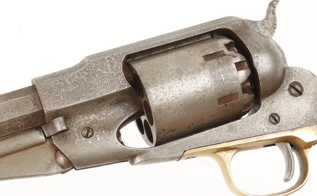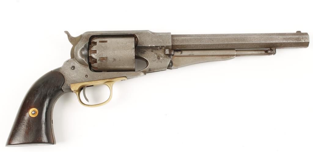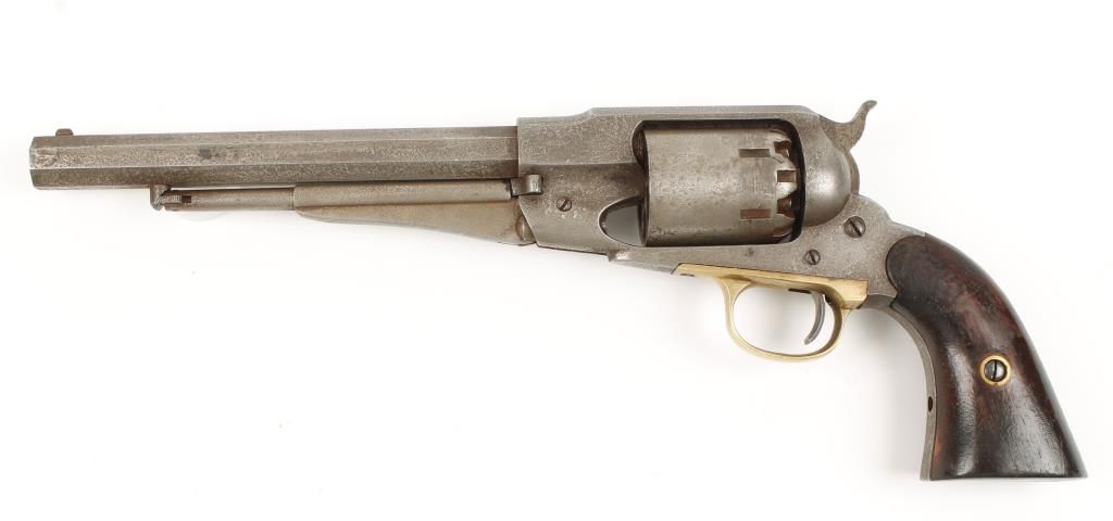 Single action percussion revolver with 8" octagon barrel. Non fluted cylinder, smooth walnut grips, brass trigger guard and loading lever holds cylinder pin in. There are no visible markings except for serial number. Shows age and has attempted to be cleaned up. Unsure if authentic.