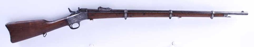 Remington Mdl 1870 Cal 11.15x57R Spanish SN:NVSNEarly model rolling block action rifle chambered in 11.15x57R Spanish, full length wood stock with 3 barrel bands and 35" barrel, sling swivel on bottom of butt stock, flip up rear sight missing slide and 1screw, metal nose cap and butt plate, with cleaning rod, good markings, excellent bore and action. Condition: In overall good to very good, traces of bluing remaining, wood has normalbruising and scratching.