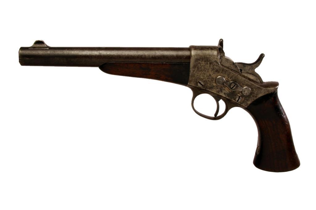 Remington Mdl 1871 Army Cal .50 SN:NVSN Post Civil War single shot rolling block pistol. Blued finish, wood one piece pistol grip and wood fore arm, 8" barrel, good bore and working action. Condition: Good overall with good markings and partial cartouche on stock.