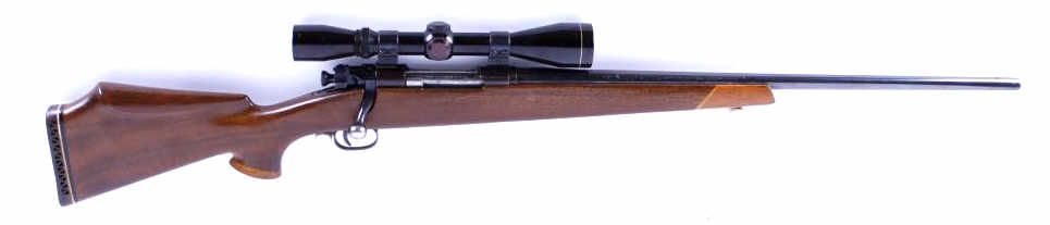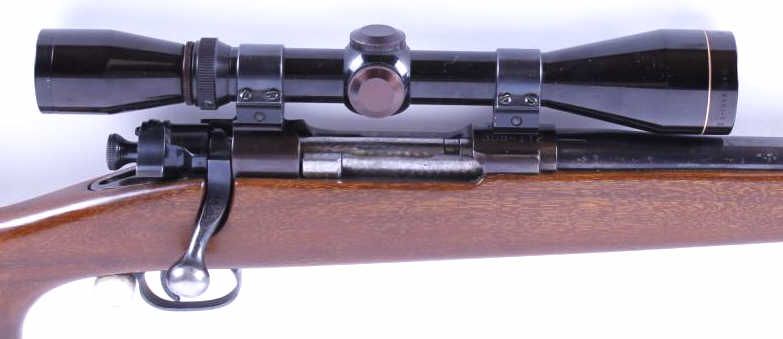 Remington Mdl 1903 Cal .30-06 SN:3084172Sporterized military bolt action non detachable box magazine rifle, blued steel 24" barrel/receiver/bottom metal/floorplate, jeweled bolt body, black alloy 2 piece scope bases/scope rings, Leupold 3-9 Vari X IIscope, laminated spacers on forend tip, grip cap and rubber butt pad, plain wood Monte Carlo stock with rollover cheek rest, holes from sling swivel studs, bedded barrel, bluing loss on barrel and bolt handle andbottom metal screw heads, good bore and action. Condition: Very good.