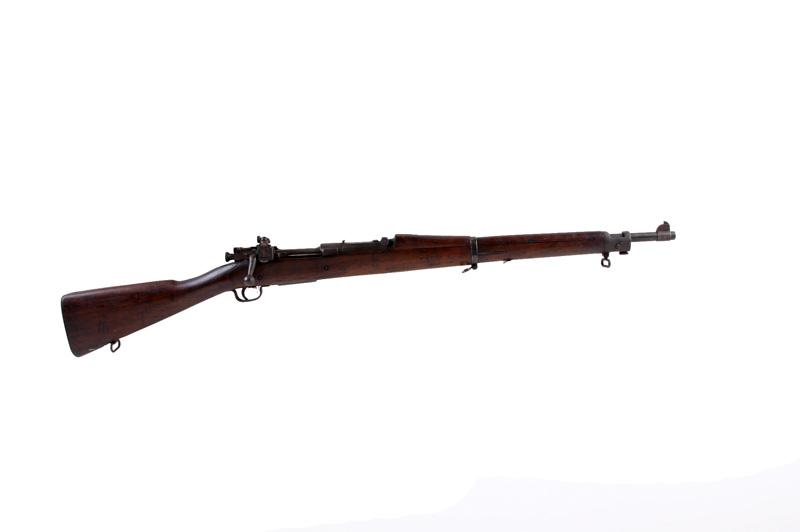 Remington Mdl 1903 Cal .30-06 SN:3212725 Bolt action U.S. military battle rifle produced just prior to the A3 release in May 1942. Parkerized finish, standard military stock with RLB cartouche on the left side, P by the trigger and no finger groove, stanBolt action U.S. military battle rifle produced just prior to the A3 release in May 1942. Parkerized finish, standard military stock with RLB cartouche on the left side, P by the trigger and no finger groove, standard 24" barrel markedR.A. 3-42 with ladder rear sight removed and a Redfield peep sight installed on the receiver, sling swivels installed but no sling, good bore and action. Condition: Very good military used condition.Stock shows average wear with a crack at the butt but not bad.