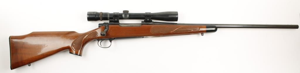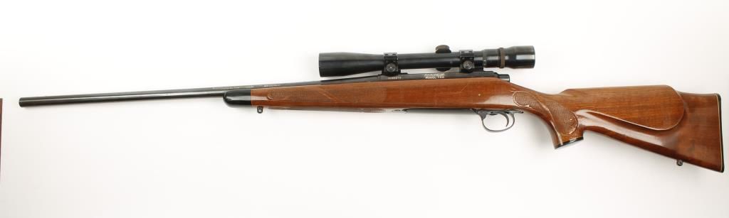 Bolt action sporting rifle with 24" barrel. Blued finish, checkered Monte Carlo walnut stock, hinged floorplate, front and rear sight have been removed and fitted with older Weaver 3-9X scope. Good bore and action. Condition: Good showing light corrosion on bolt handle and moderate use.