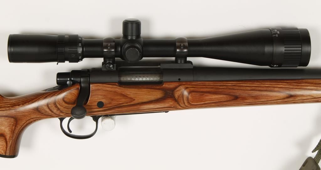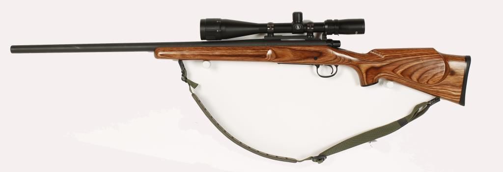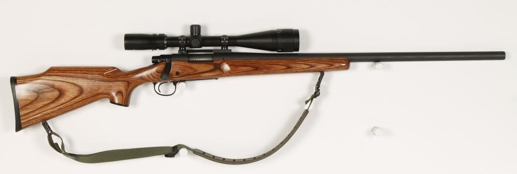 Bolt action sporting rifle re-chambered for the popular .243 Ackley Improved cartridge with 26" heavy barrel. Matte blued finish, laminated Monte Carlo stock with beavertail forearm, black rubber butt plate, no sights, sling and fitted with Tasco 6-24x with adjustable objective lens. Good bore and action. Includes Redding dies, 71 rounds of loaded ammo and 26 rounds of empty brass. Condition: Very good showing small scratches in wood. *Modern Firearm*