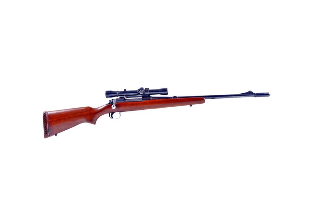 Remington Mdl 721 Cal .30-06 SN:238579 Nice bolt action hunting rifle in standard .30-06 caliber. Blued finish, walnut semi pistol grip stock with rubber butt pad, 20" barrel with ported recoil suppressor, front sight intact but rear iron sight removed aNice bolt action hunting rifle in standard .30-06 caliber. Blued finish, walnut semi pistol grip stock with rubber butt pad, 20" barrel with ported recoil suppressor, front sight intact but rear iron sight removed and an older style Weaver scope mounted on the receiver, good bore and action. Condition: Very good to excellent with some wear especially to the floor plate. Trigger shoe installed.