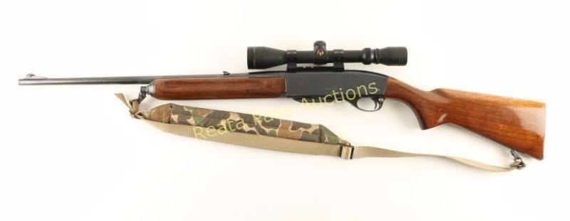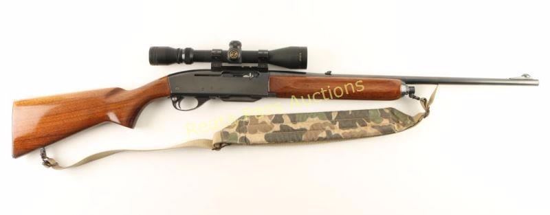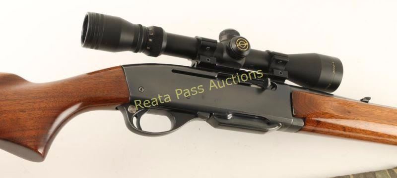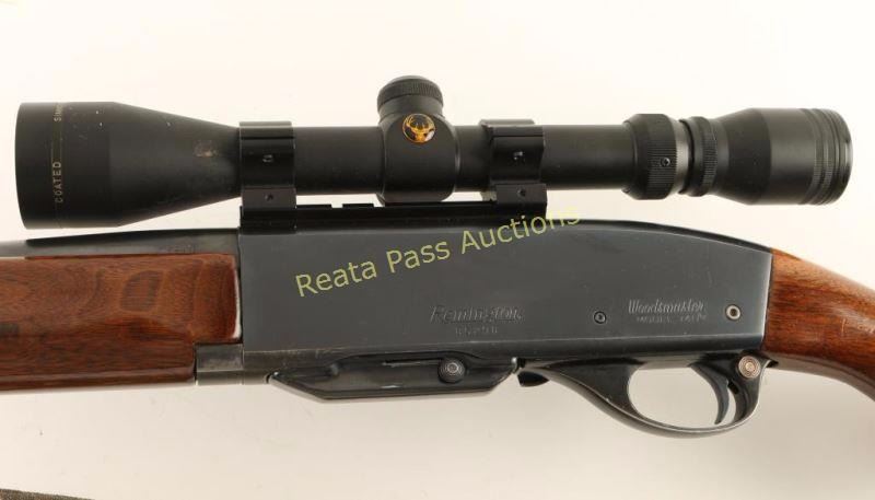 'Woodsmaster' Magazine fed semi-automatic sporting rifle chambered in .30-06 Springfield. Features a blued finish, 22" barrel, ramped blade front sight, adjustable flip-up rear sight, Simmons3x-9x 40mm scope, 4 round detachable magazine, push button safety, smooth trigger, camo sling, grooved smooth walnut forend and pistol grip shoulder stock with serrated metal buttplate. Rifle retains approximately 92% of it's original blued finish showing light wear on the underside of the receiver and few scattered light scratches. Action is crisp, bore is excellent and wood stocks are near fine. Condition is very good++. ***Modern Firearm***