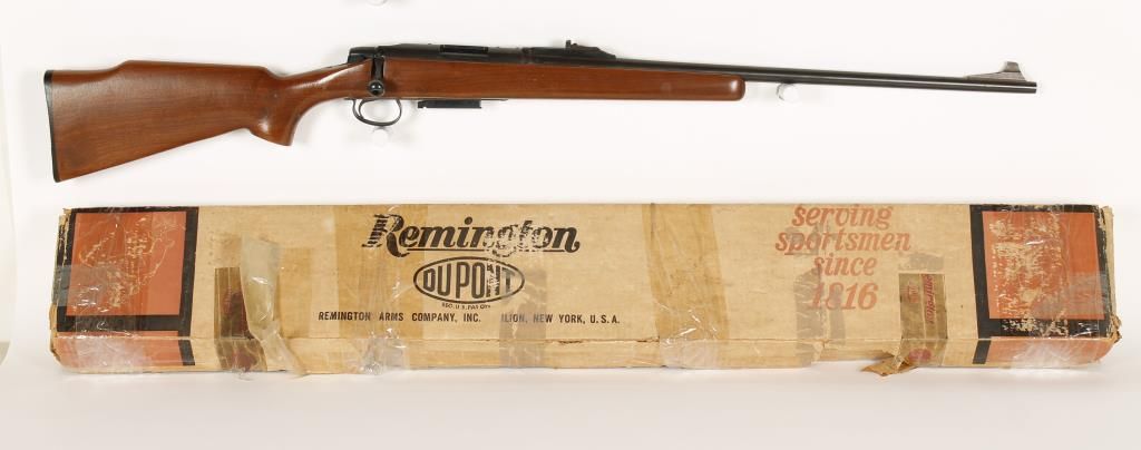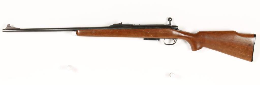 Bolt action magazine fed sporting rifle discontinued in 1983 with 24" barrel. Blued finish, plain Monte Carlo style stock, black plastic butt plate and open sights. Very good bore and action. Includes original box. Condition: Good to very good showing light dings and scratches in wood. *Modern Firearm*