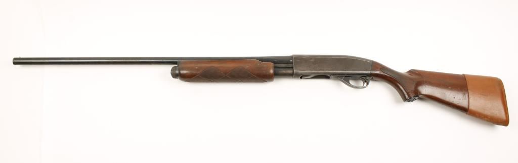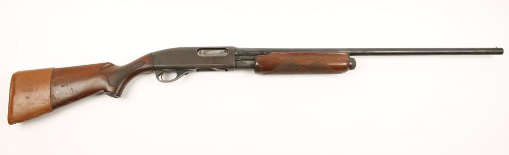 Early model pump action shotgun with 28" modified choke plain barrel. Blued finish, checkered pistol grip walnut stock and pump handle, no rib and slip on recoil pad has been added. Good bore and action. Condition: Fair showing light pitting, bluing wear and wood shows age. *Modern Firearm*