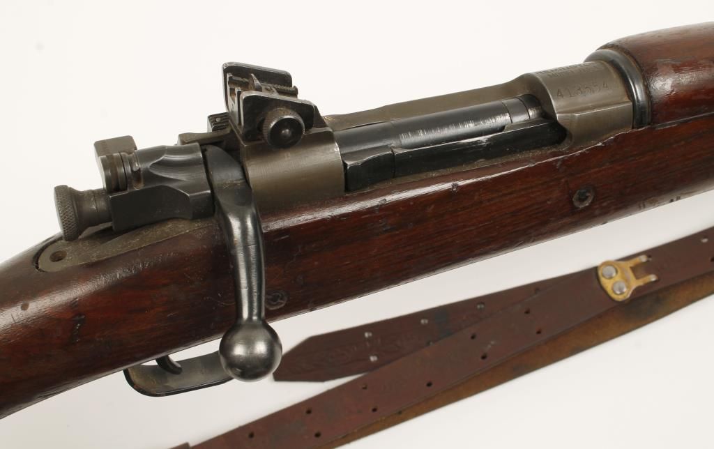 Bolt action military rifle with barrel date of 10-43 with 24" barrel. Green parkerized finish, plain straight grip full length wood stock and upper hand guard, hooded front sight, adjustable aperture rear sight and bayonet lug. Good visible cartouches on left side and bottom of stock. Fair bore and good action. Includes period correct leather sling. Condition: Good overall showing normal wear to wood. *Curio & Relic Firearm*