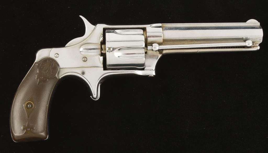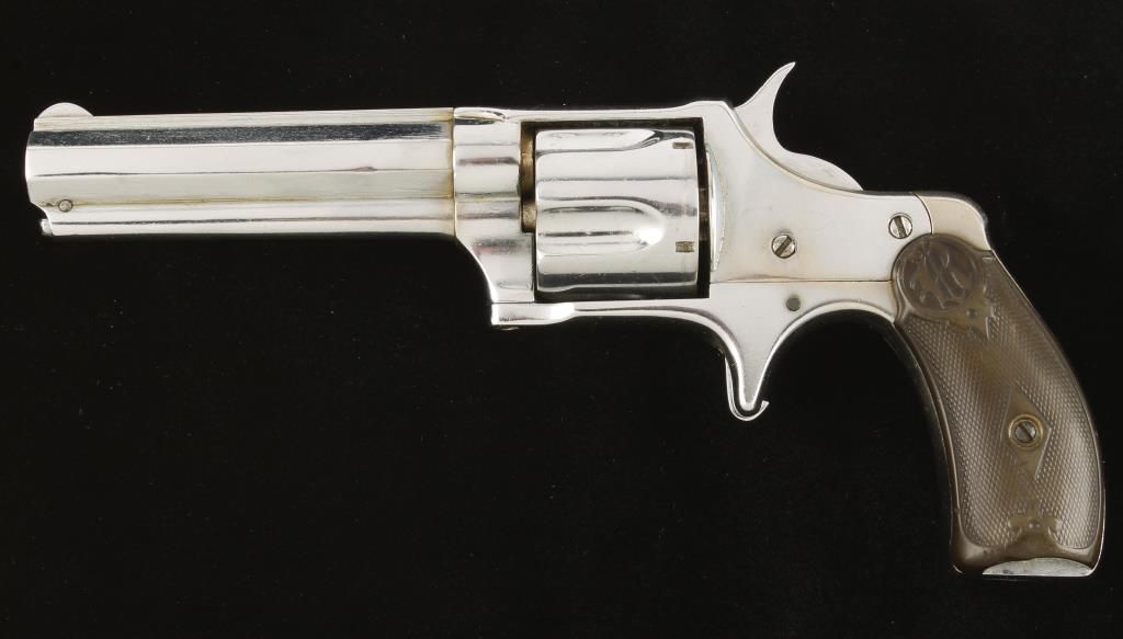Single action spur trigger 5 shot revolver circa 1880's with 3-3/4" octagon solid rib barrel. Renickeled finish, round butt checkered hard rubber grips, ejector rod and fixed sights. Fair markings and action will not stay cocked back. Condition: Fair as refinished and grips show wear with left grip panel showing large chip at butt. *Antique Firearm*