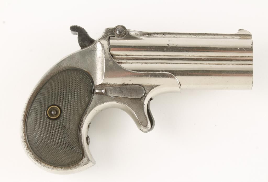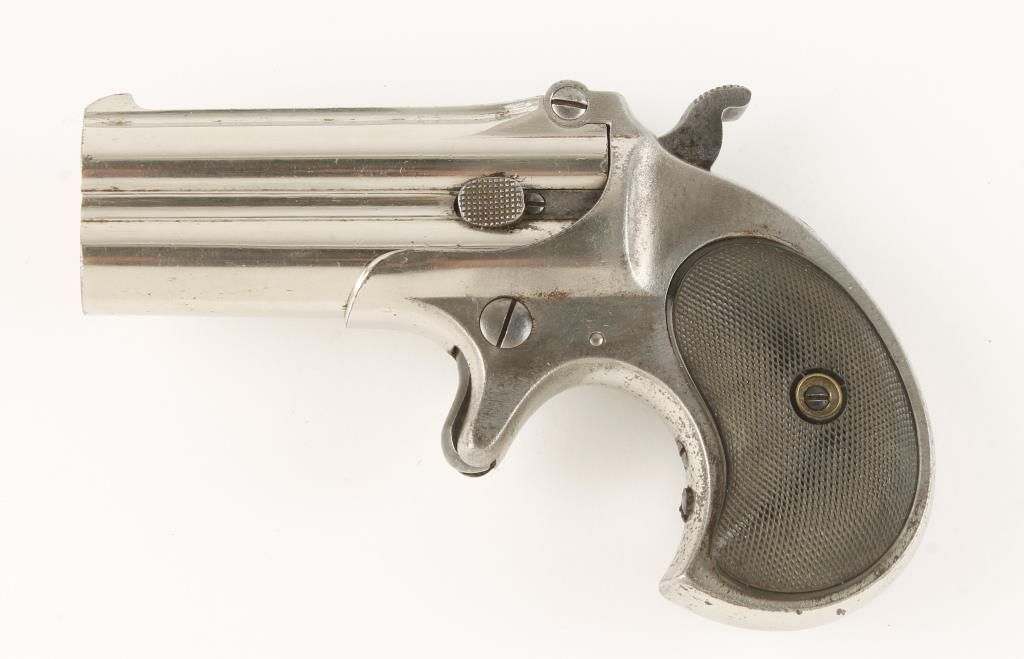 Early model over under spur trigger derringer made in early 1890's with 3" barrels. Nickel finish, checkered hard rubber grips and fixed sights. Good markings and very good working action. Condition: Very good showing 60% nickel, light pinpricking on frame and grips are very good showing no loss. *Antique Firearm*
