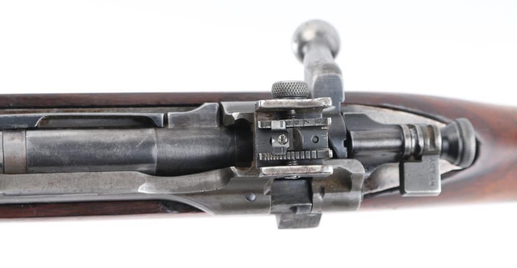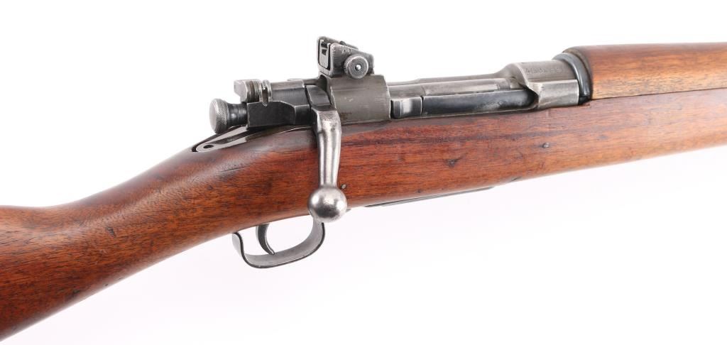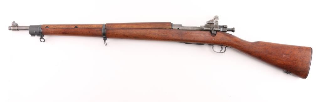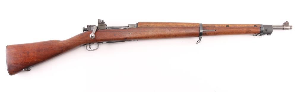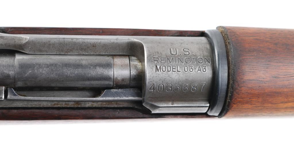 U.S WWII era military bolt action rifle manufactured circa 1944. Features blue/parkerized finish, walnut straight grip shoulder stock, walnut handguard, 24" barrel, blade front sight, original peep rear sight mounted to receiver, bent bolt handle (Stamped "R"), manual safety, magazine cut-off switch, sling swivels, stacking swivel, butt trap with hinged cover, checkered flat steel buttplate. Bottom metal and bands are stamped. Bore is very good condition. Parkerized barrel, and receiver. Retains 65% finish with bare metal visible where moving parts rub, handling loss,finish loss on the bolt/extractor. Stock is very good condition, handling marks throughout, 'P' proof on underside of wrist.. Barrel marked "HS / (flaming bomb) / 7-44". (Remington had a "Spare parts contract with High standard, common to see on Remington 03-A3's. Action is crisp/tight. NRA Condition-Good. C&R Firearm.