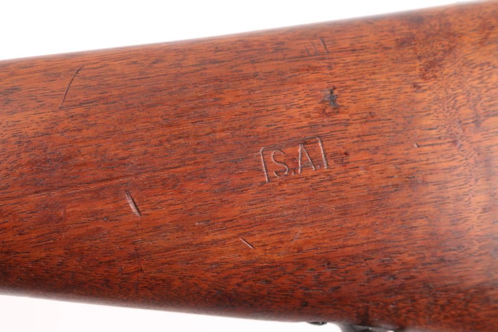 GOOD: Some minor replacement parts; metal smoothly rusted or lightly pitted in places, cleaned or re-blued; principal letters, numerals and design on metal legible; wood refinished, scratched bruised or minor cracks repaired; in good working order.