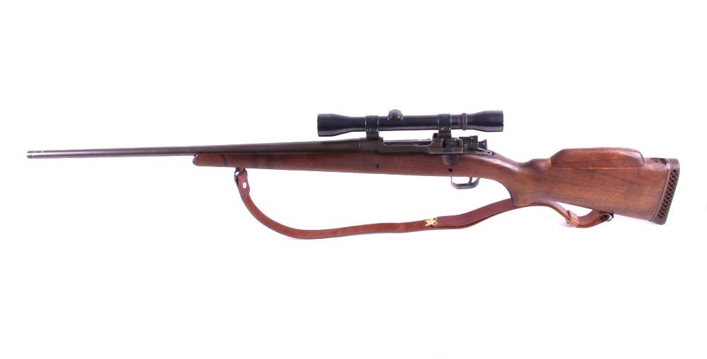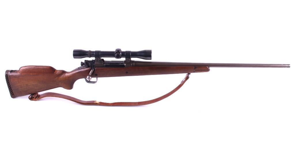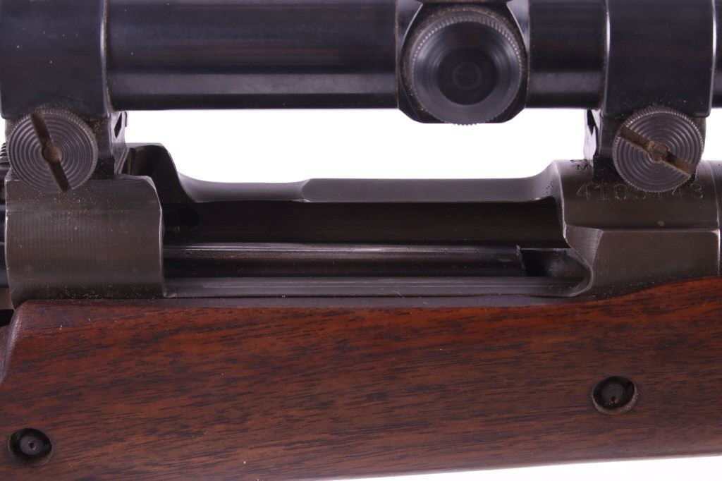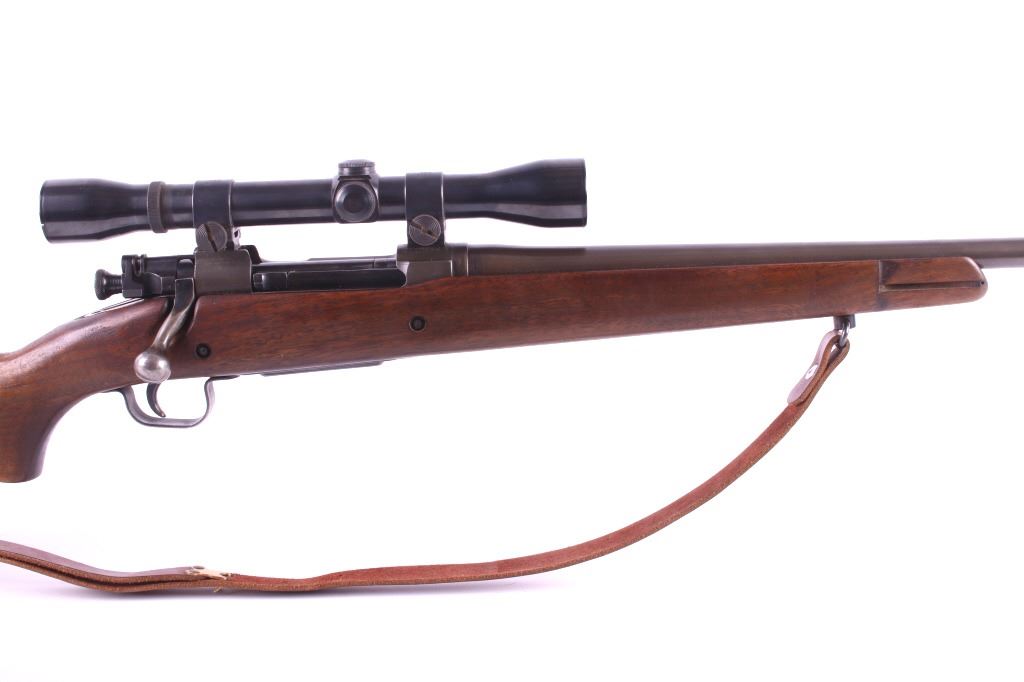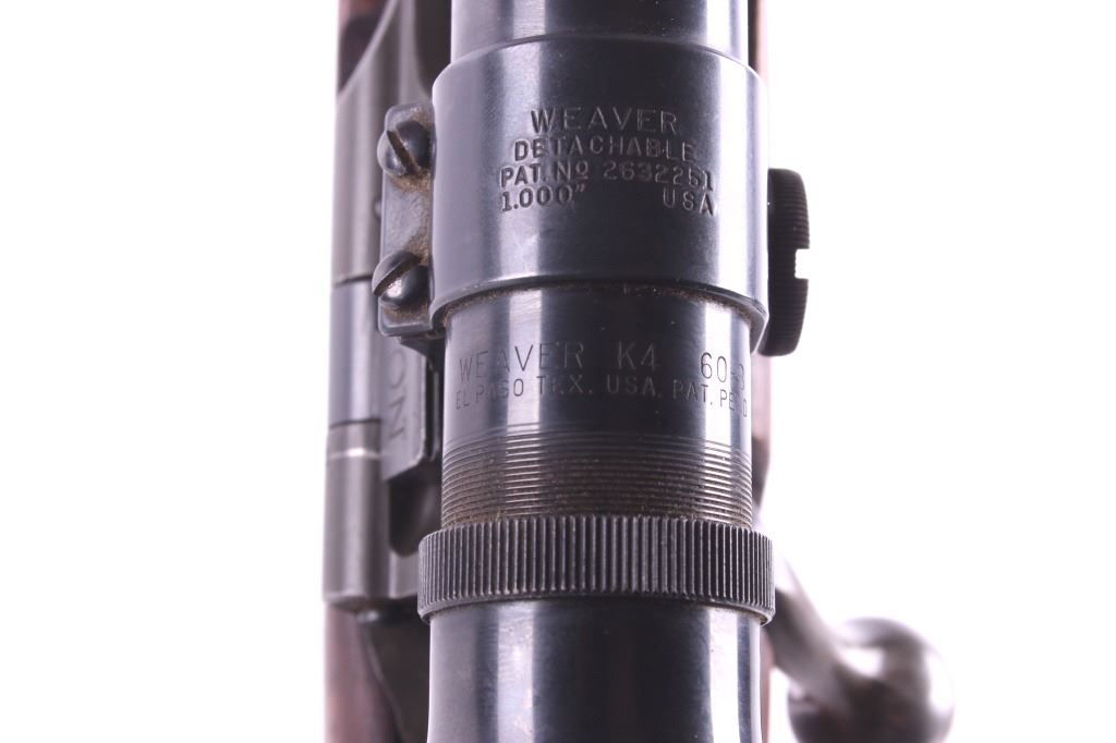 For your consideration is a Remington model 03-A3 bolt action rifle. The rifle has the correct Remington "R" marked bolt with the handle milled for scope clearance. The barrel has had the front and rear sights removed. A Weaver K4 60B scope has been mounted. The receiver has the distinctive markings that consist of "U.S. - REMINGTON - MODEL 03-A3" on the left side of the receiver between the edge of the stock and the telescopic sight base. The right side of the receiver is roll-stamped with the serial number "4105743". The barrel is roll-stamped with "R A" above the date "9-43". This rifle is in excellent condition and has an updated hard rubber butt stock. This rifle qualifies as a Curio & Relic Long Gun, and requires FFL Transfer or NICS Background Check. Serial Number: 4105743