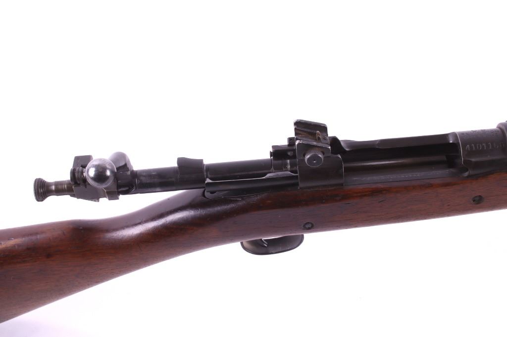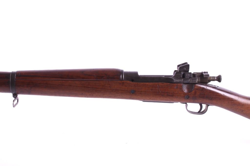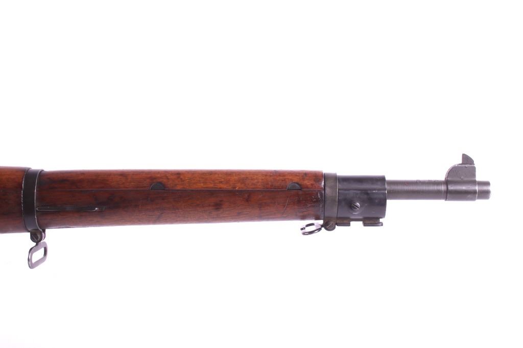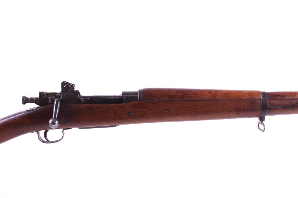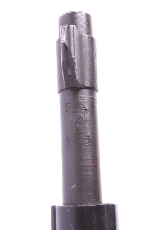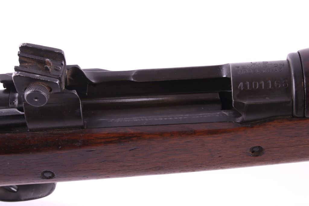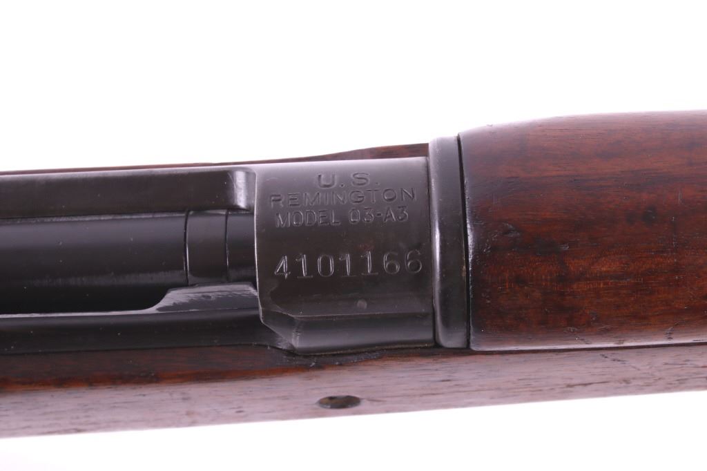 For your consideration is a Remington model 03-A3 bolt action rifle. The rifle has the correct Remington "R" marked bolt with the handle milled for scope clearance. The sling swivel, trigger guard, lower barrel band, upper sling swivel and upper barrel band are correct. The barrel is correctly fitted with a front sight and rear sight, reticle is missing from the rear sight. The receiver has the distinctive markings that consist of "U.S. - REMINGTON - MODEL 03-A3" on the left side of the receiver between the edge of the stock and the telescopic sight base. The right side of the receiver is roll-stamped with the serial number "4101166". The barrel is roll-stamped with "R A" above the Ordnance "Shell & Flame" insignia and the date "9-43". This rifle is in excellent condition and retains the original metal butt stock. This rifle qualifies as a Curio & Relic Long Gun, and requires FFL Transfer or NICS Background Check. Serial Number: 4101166