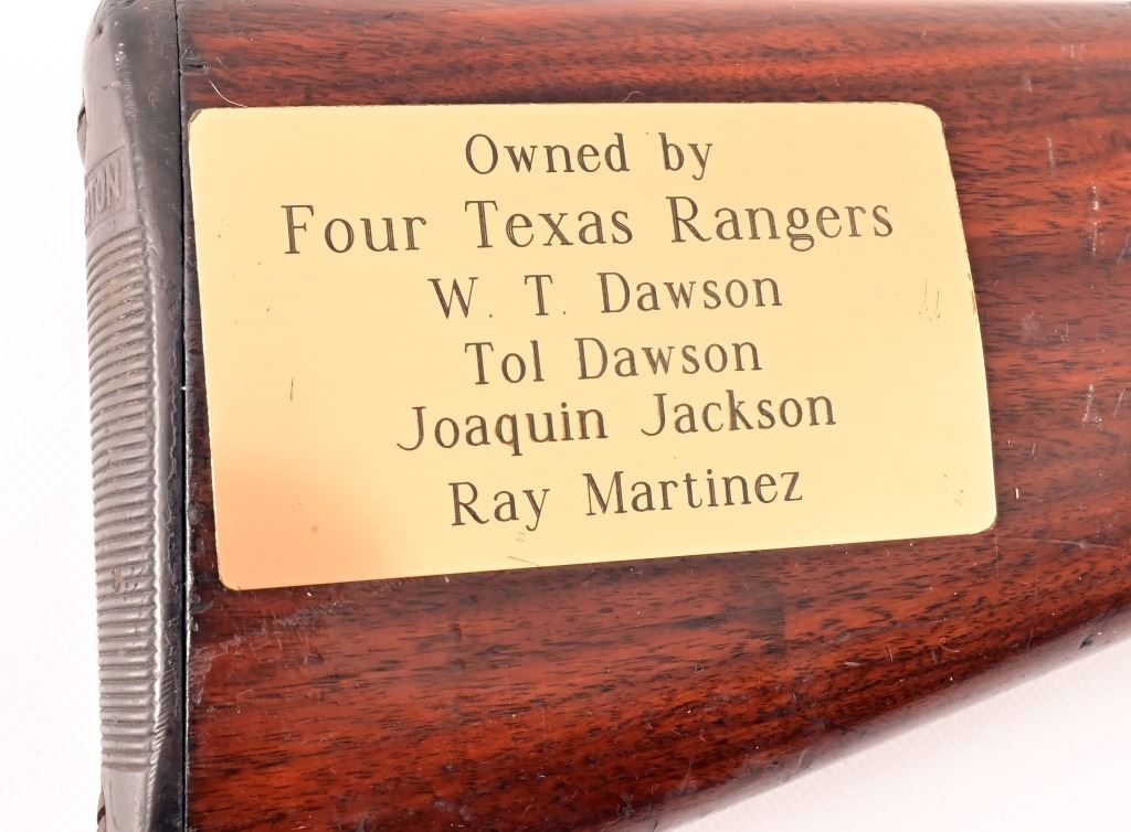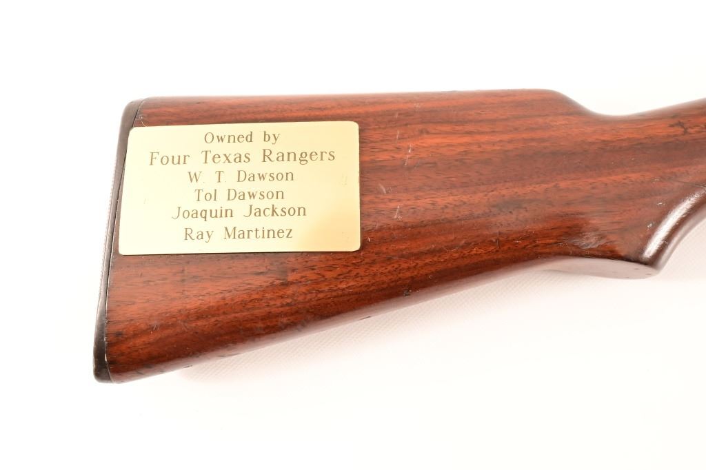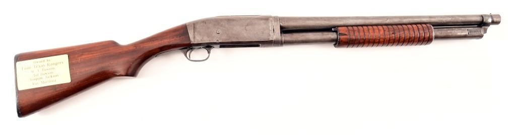 S/N U58312, manufactured 1927. This Remington shotgun has a remarkable law enforcement history. The 26 inch barrel was shortened to approximately 17.5" to a take-down riot gun configuration in order to effectively be utilized in closing police work. Its first known owner was Mr. W.T. Dawson. Mr. Dawson had a distinguished law enforcement career. He carried this Remington Model 10A as a city policeman in Del Rio, Texas and later as a Deputy Sheriff of Val Verde County. He lastly used this shotgun during his tenure as a Special Texas Ranger; guarding railway interests of the Southern Pacific Railroad. He passed this Remington Model 10A to his son Tol Dawson. Tol was a regular Texas Ranger who distinguished himself as a member of Company D under the command of Capt. Allee. He is known for assisting Capt. Allee and Ranger Joaquin Jackson on 12 April 1964 in preventing 10 prisoners from breaking jail at the Dimmit County Jail in Carrizo Springs. His partner and former Ranger Joaquin purchased this Shotgun on 07-26-2010 from Tol's son making him the third Ranger to own this weapon. Joaquin sold it to his friend Donald Piekert on 09-09-2010. Don remained in possession of the shotgun until 11 Oct 2014 when he gave it to the well know Texas Ranger Ray Martinez.