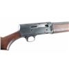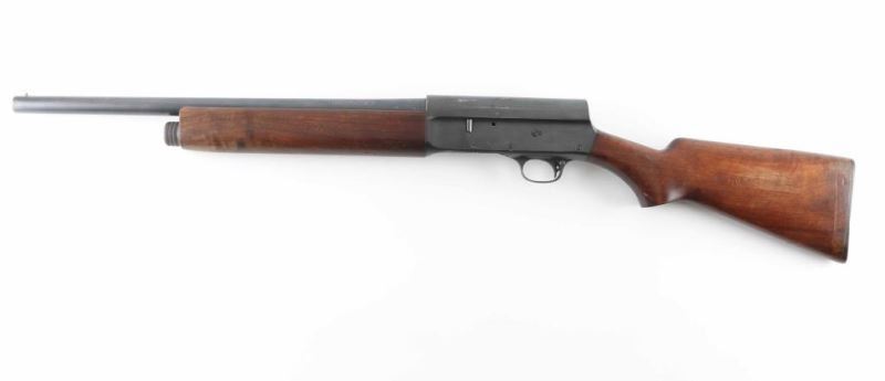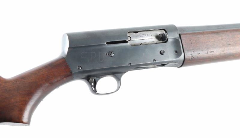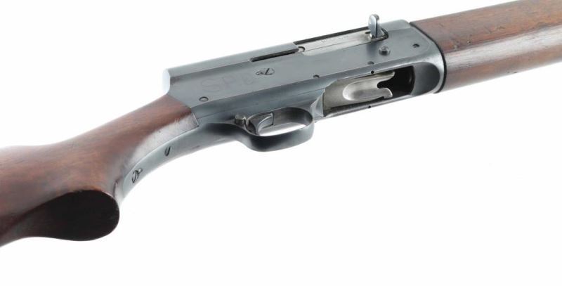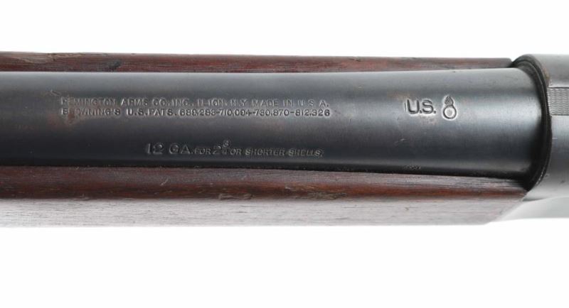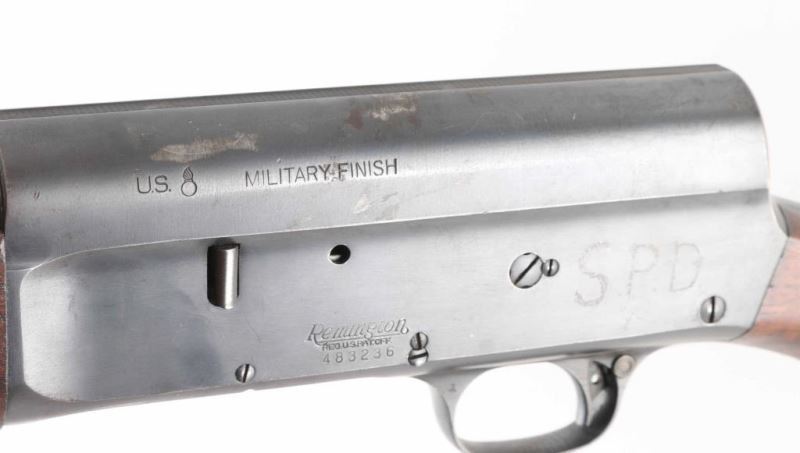 WWII era U.S. military recoil operated semi-automatic combat shotgun chambered for 2 3/4" or shorter shells, manufactured circa 1942. Features a blued "MILITARY FINISH", 20" barrel marked "CYL", steel bead front sight, tube magazine, push button safety, smooth trigger, serrated charging handle. Marked "US" with 'flaming bomb' emblem on left of receiver and top of barrel, stamped "FJA" with crossed cannons on left side of stock behind wrist. Marked "SPD" in large letters with electric engraving pencil on both side of receiver. Bore is good condition, might improve with cleaning. Retains 75% finish, beginning to turn to patina along barrel, showing bare metal on edges and high spots, several areas of cleaned patina on receiver showing rough texture and bare metal. Wood is good or better condition, appears lightly varnished, with small creases & scratches. Dark brown Remington buttplate is in good condition. Condition is NRA Good++ ***C&R Firearm***