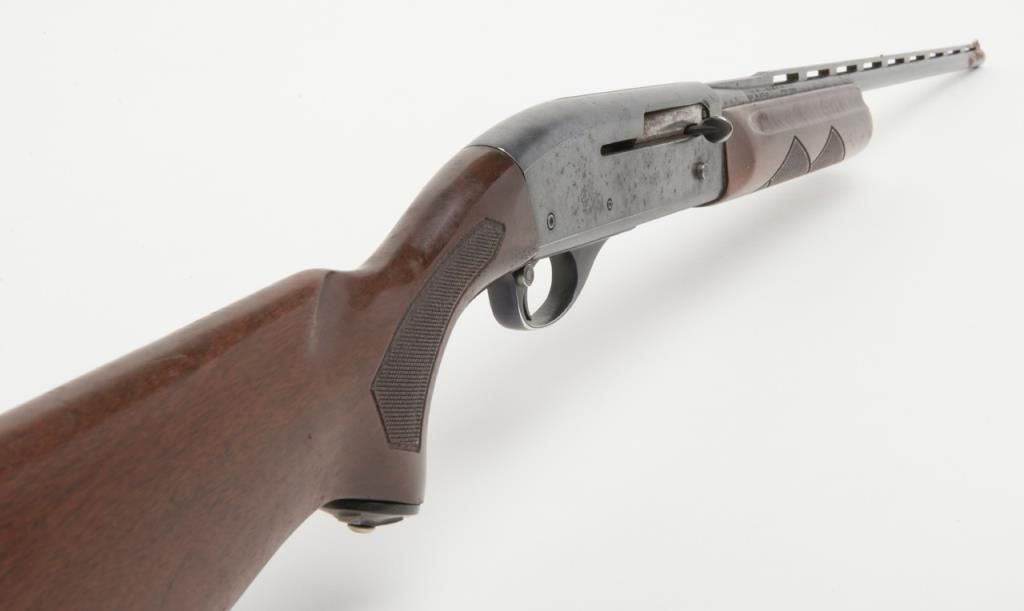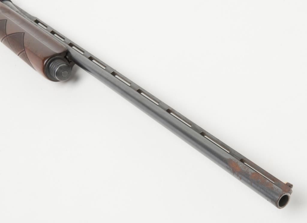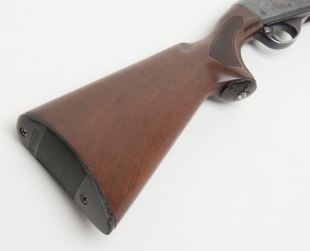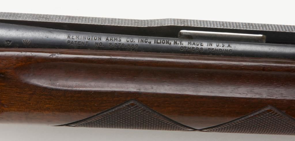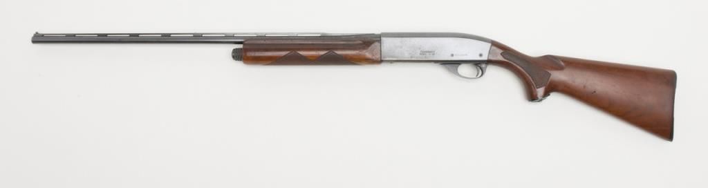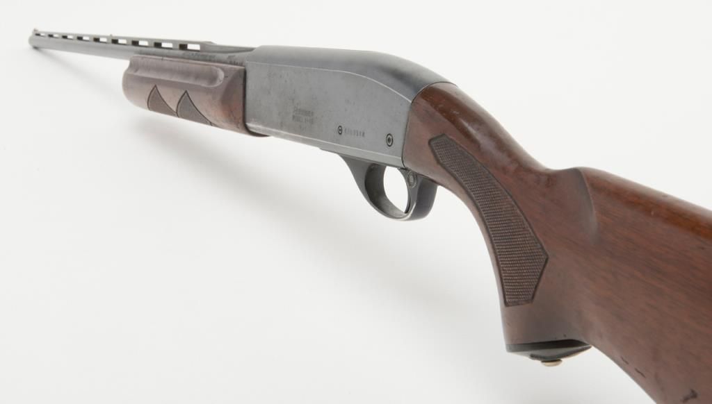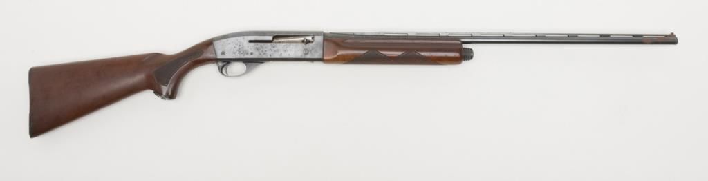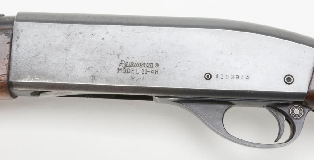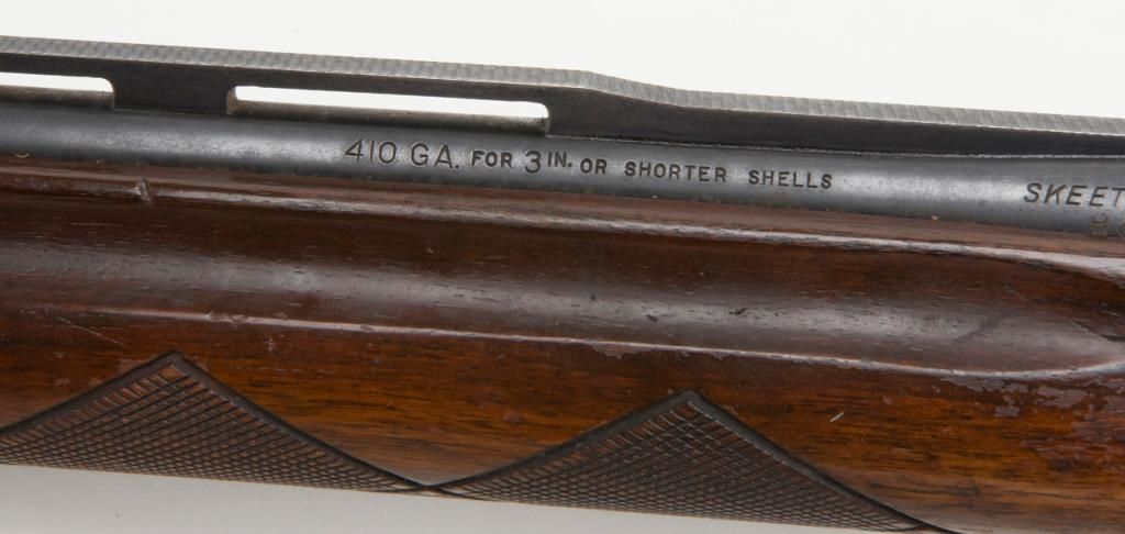 Remington Model 11-48 semi-automatic shotgun, .410 gauge, Serial #4103944. The shotgun is in overall good condition with a 25” blued barrel, marked “Skeet”. The barrel has a full length filed and ventilated rib with an ivory bead frontsight. The barrel retains nearly all of its blued finish with some moderate surface rust near the muzzle; the action has light surface erosion as well. The checkered wood stocks are in good condition with mars and compressions consistentwith use, a 13 ¾” length of pull and a hard rubber Remington marked butt plate. The bore is good, action crisp and markings legible on this shotgun. (Modern/PPT). Est.: $350-$700.