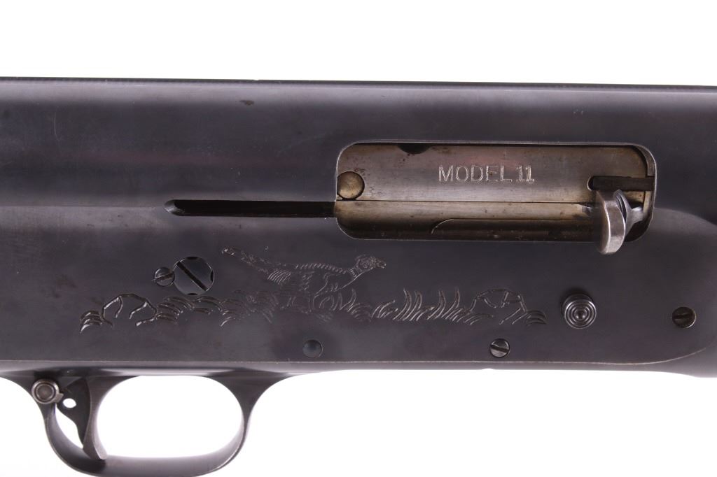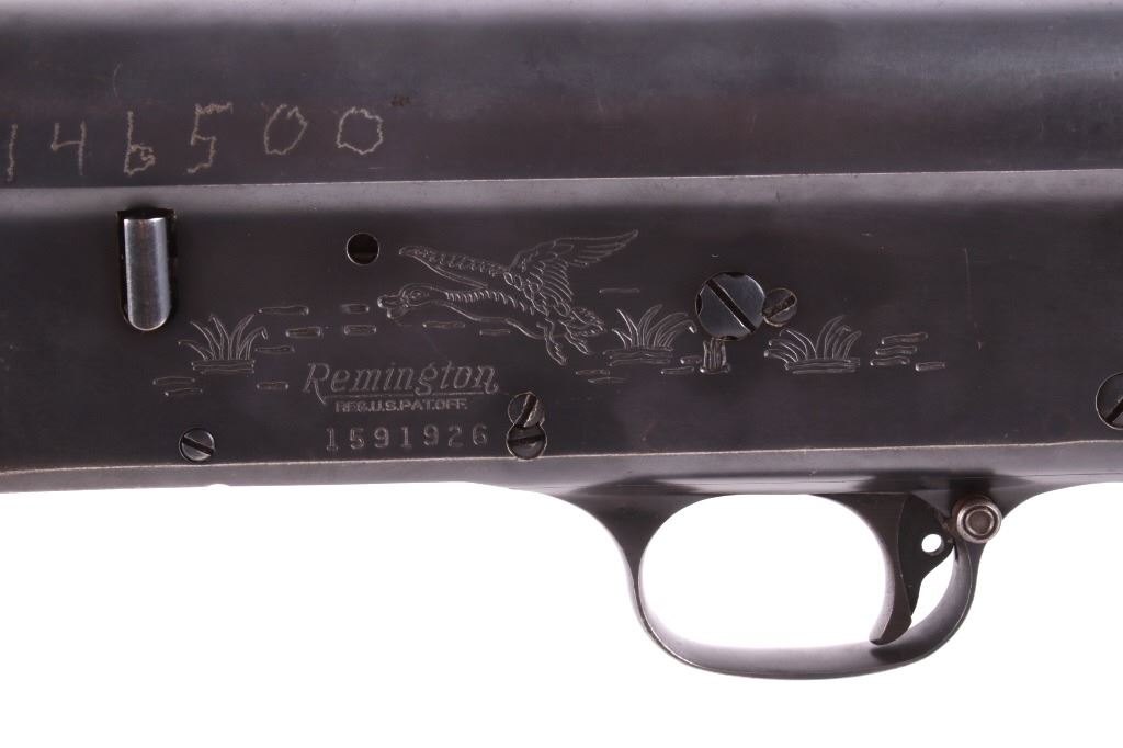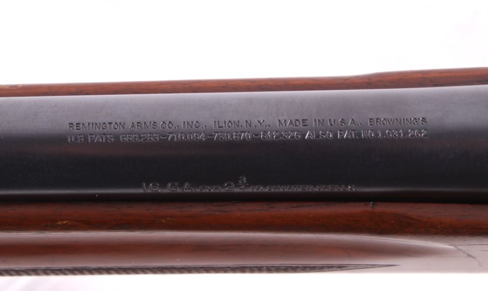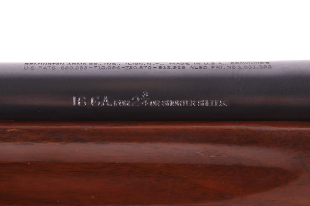 Included in this lot is a Remington Model 11 semi-automatic 16 gauge shotgun. John Moses Browning designed his definitive Auto-5 shotgun in 1898. The Auto-5 hit the commercial market in 1900 as the world’s first successful autoloading shotgun. Browning attempted to sell his Auto-5 design to Winchester, only to have company officials balk at his terms. He subsequently offered his design to Remington. In a darkly unexpected turn of events, Remington’s president died of a heart attack in the midst of negotiations. Browning eventually revisited his arrangement with Remington, and the company produced his design in the United States from 1905 to 1947. This shotgun shows a lovely gray patina 28" round barrel. The barrel is marked "Remington Arms Co., Inc. Ilion N.Y. Made in U.S.A. Browning’s U.S. Pats 689.283-710.094-730.870-812.326- Also Pat. No. 1.931.262 – 16 GA. For 2 ¾ or shorter shells”. The receiver retains some of its original blue and the stock is in good condition with small scratches and dings from wear and use. The left side of the receiver has been engraved and reads “N 1/ 0146500”. The shotgun has a select choke allowing for six different possible choke optins. Serial Number: 1591926. This firearm qualifies as a Curio & Relic, and requires FFL Transfer or NICS Background Check.