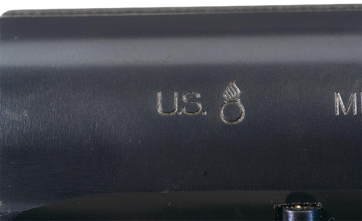 This is an example of a late WWII U.S. Navy contract Remington Model 11 in like new condition. Single bead sight with "CYL." marked choke, an anchor stamp (Navy acceptance proof) on the left side and standard 2-line address and "U.S. (bomb)" on top. Standard receiver and bolt markings, with "U.S. Ordance bomb proof, with MILITARY FINISH" on the upper left side. Smooth straight grip stock, with a beavertail forearm, crossed cannon and "FJA" inspection marks on the left side of the buttstock, and a serrated plastic buttplate. Length of pull is 13 3/4".
