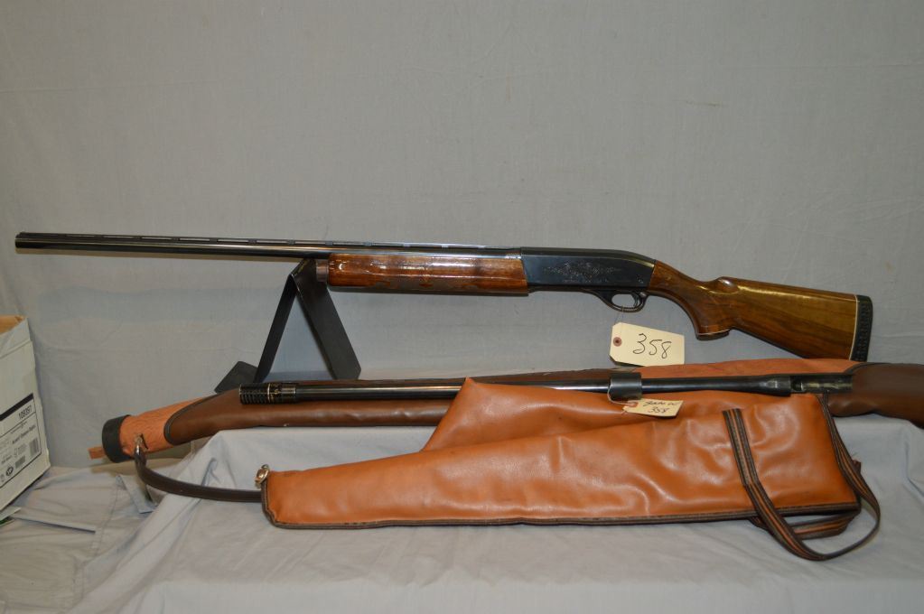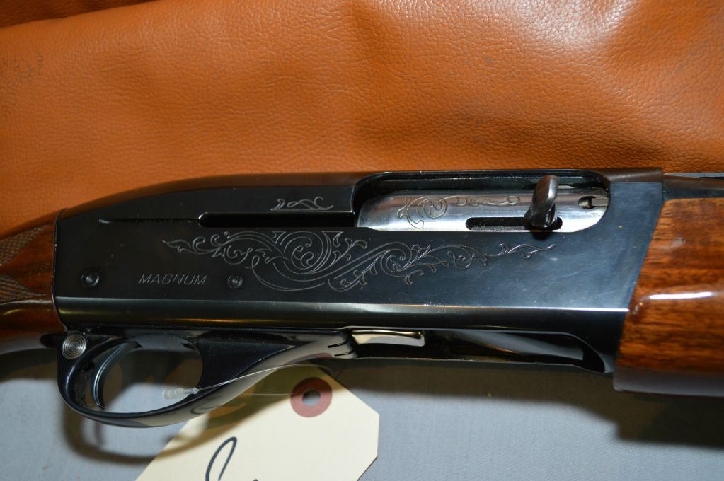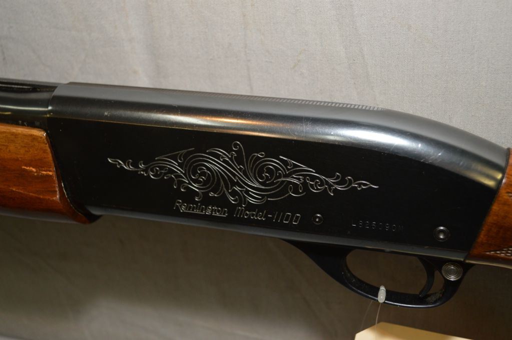 Remington Model 1100 Magnum .12 Ga 3" Magnum cal Semi Auto Shotgun w/ 30" vent rib bbl [ appears v-good, blued finish, hi gloss finish, pressed checkered pistol grip stock & forend, w/ Remington recoil pad, note : Diamond filled in w/white material, c/w spare .12 Ga 3 1/2" 26" vent rib bbl w/Cyclone Poly Vent Variable Choke & soft gun case , blued finish, some light pitting, c/w Shakespeare gun case ] Ser # L825090M