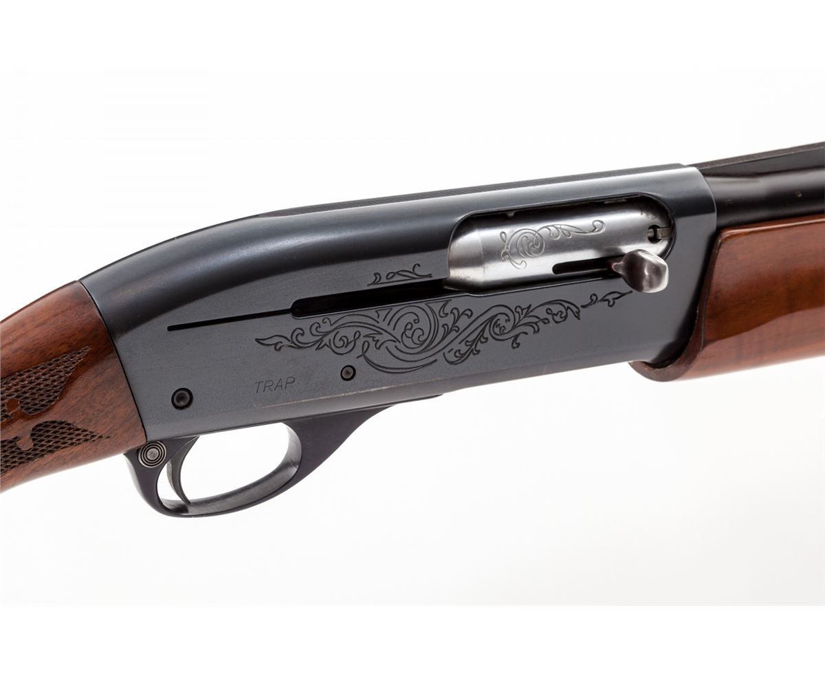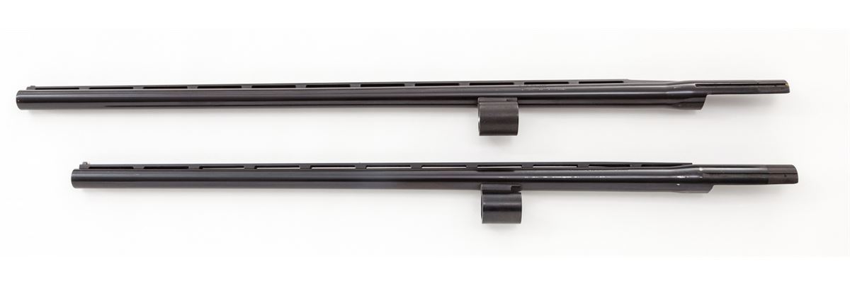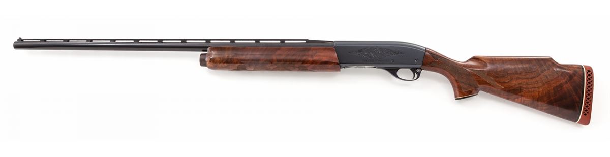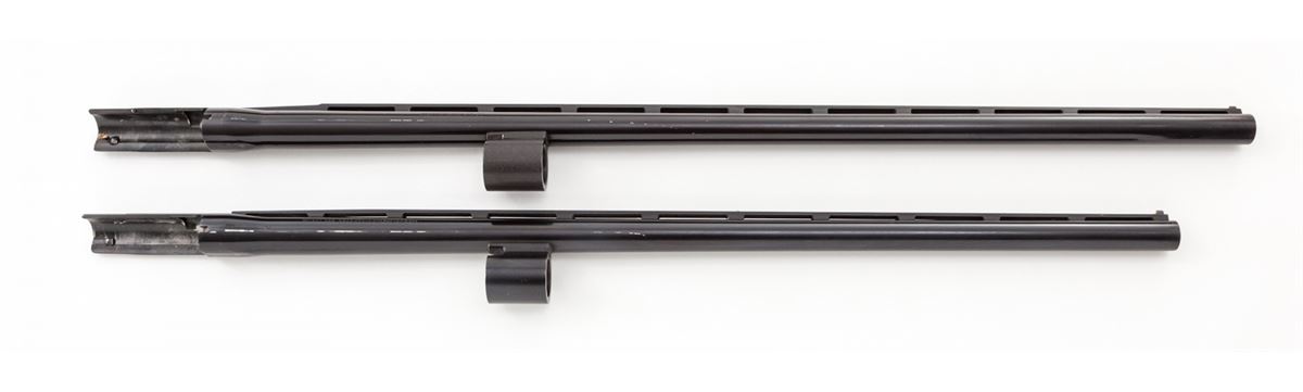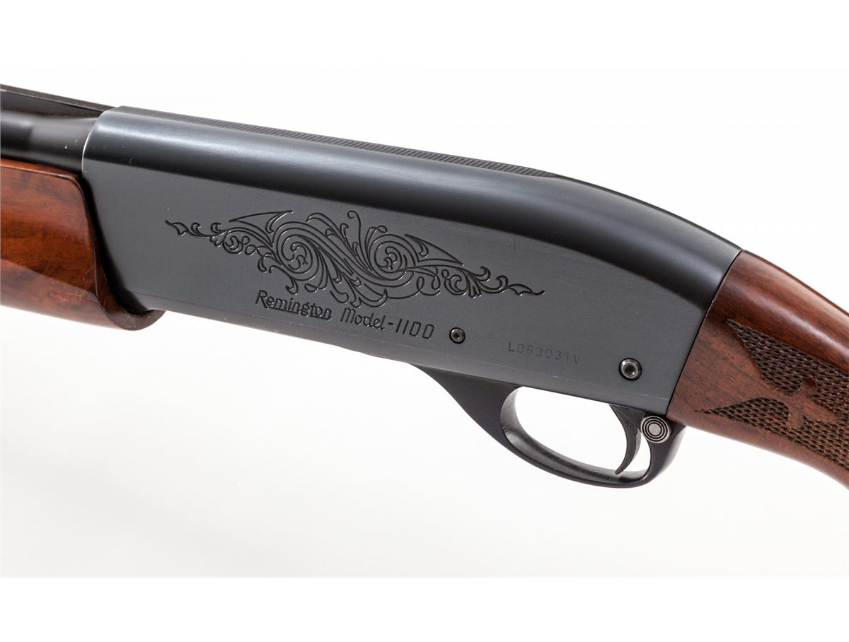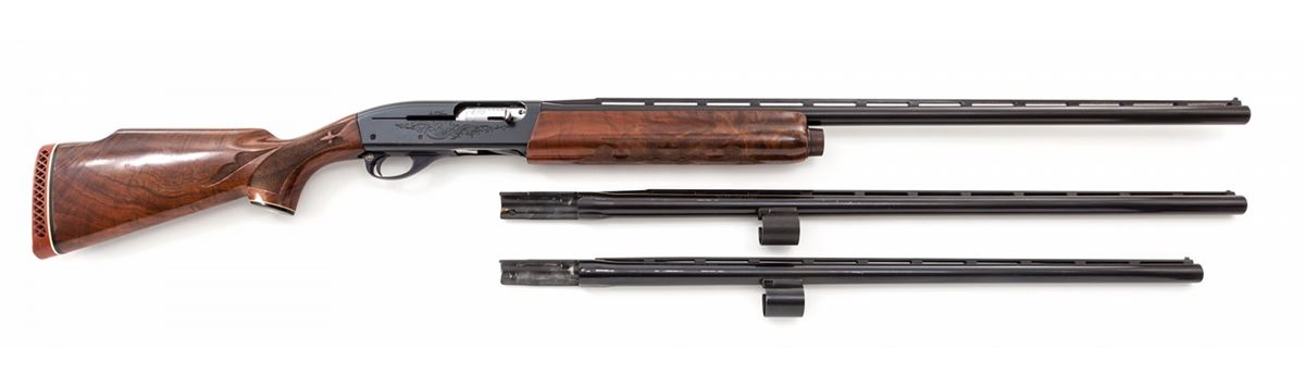 Remington Model 1100 Semi-Automatic Shotgun, with two extra barrels, #L063031V, 12 ga., 30'' vent rib barrel choked Full; 26'' barrel choked Skeet; and a 28'' vent rib barrel choked Mod.; blue finish, select grain pressed checkered walnut stock,, with Remington red rubber butt pad. Condition is fine showing thinning at balance point and light general field use. Crisp action, all bores are bright. Est.: $500-$750. (Modern)