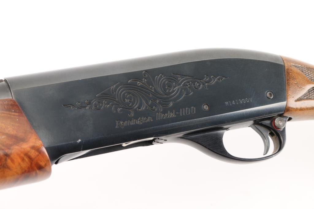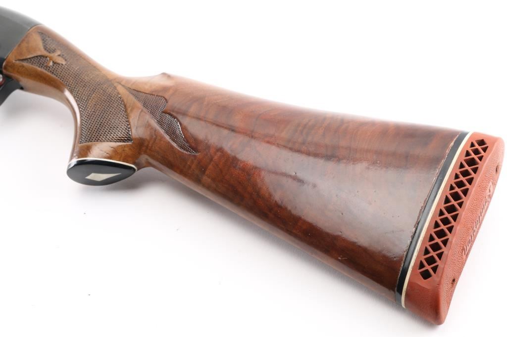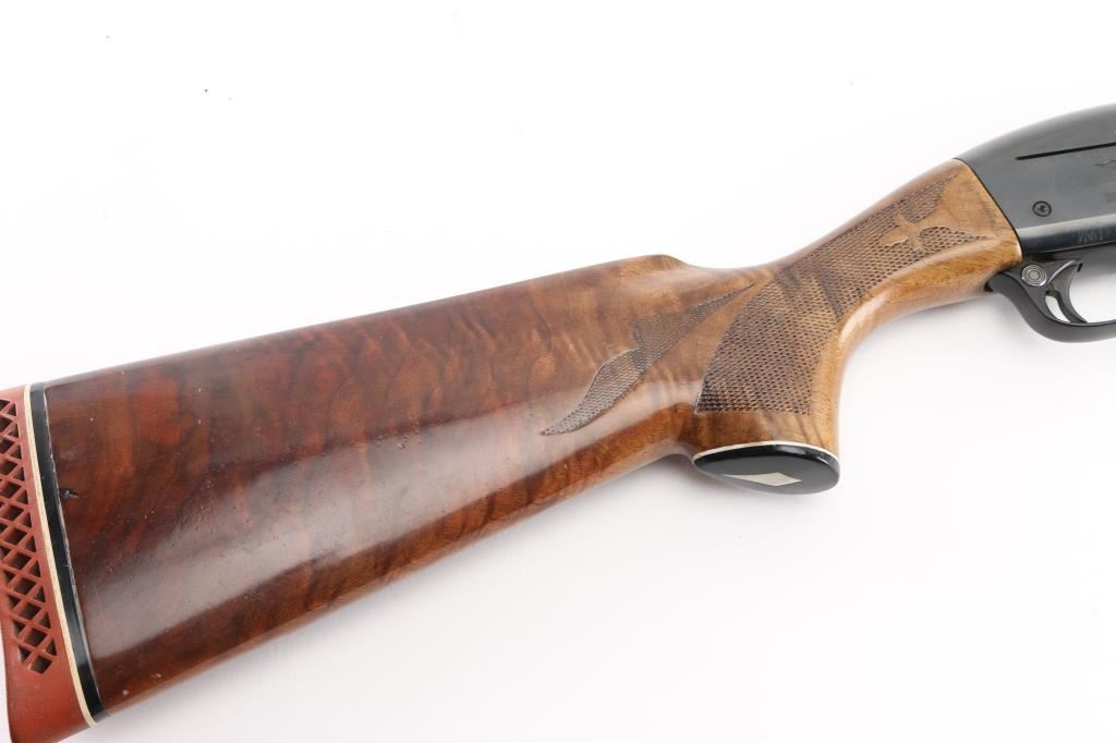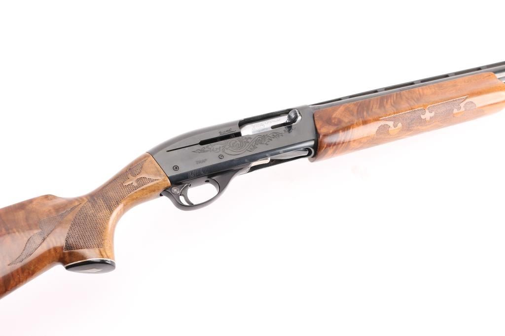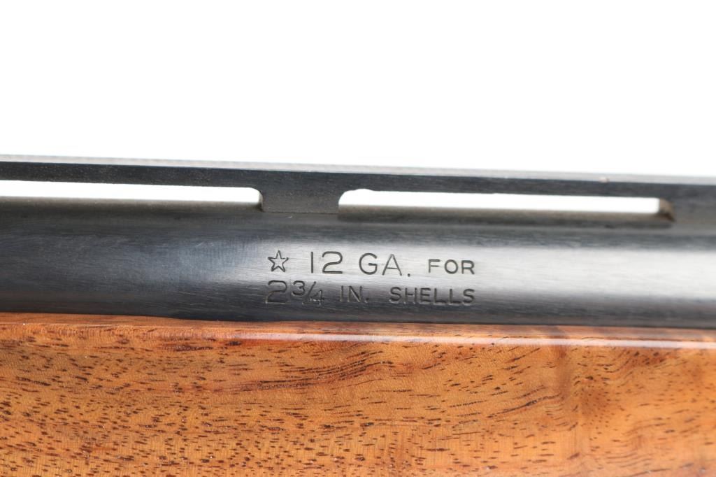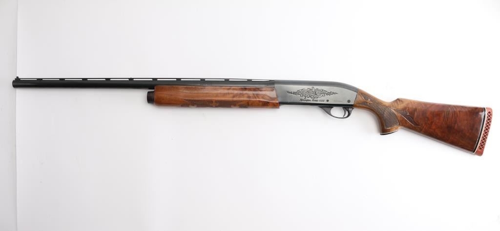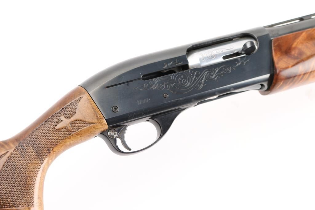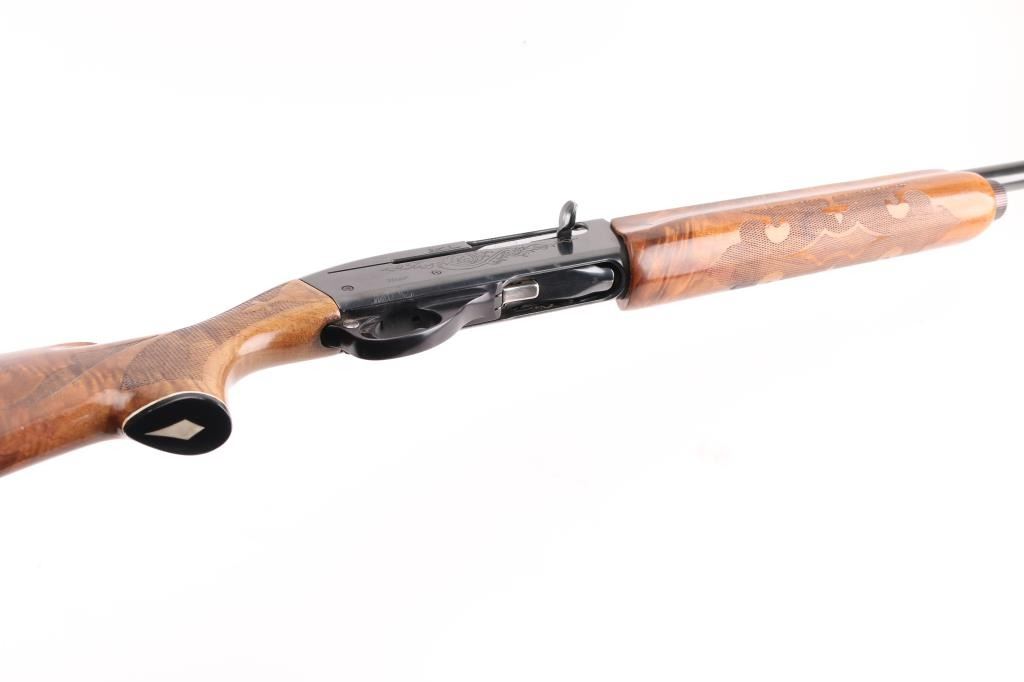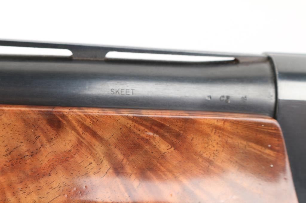 SN: M141900V. Engraved recoil operated semi-automatic shotgun chambered for 2 3/4" 12 Gauge shells, and built on a 12 gauge frame. Features a blued finish, skeet choked 25 5/8" vent rib barrel, white bead front sight, small silver bead mid-sight, half length magazine tube, scroll engraved receiver & bolt, push button safety, beveled trigger, glossy press checkered walnut forend and pistol grip shoulder stock with factory recoil pad & 14 1/4" LOP. Shotgun exhibits approximately 98% of it's original blued finish showing some minor scratches on the receiver. Action is smooth, bore is excellent/bright and wood stocks are near fine. Manufactured 2005. Condition is NRA Excellent. Modern Firearm.