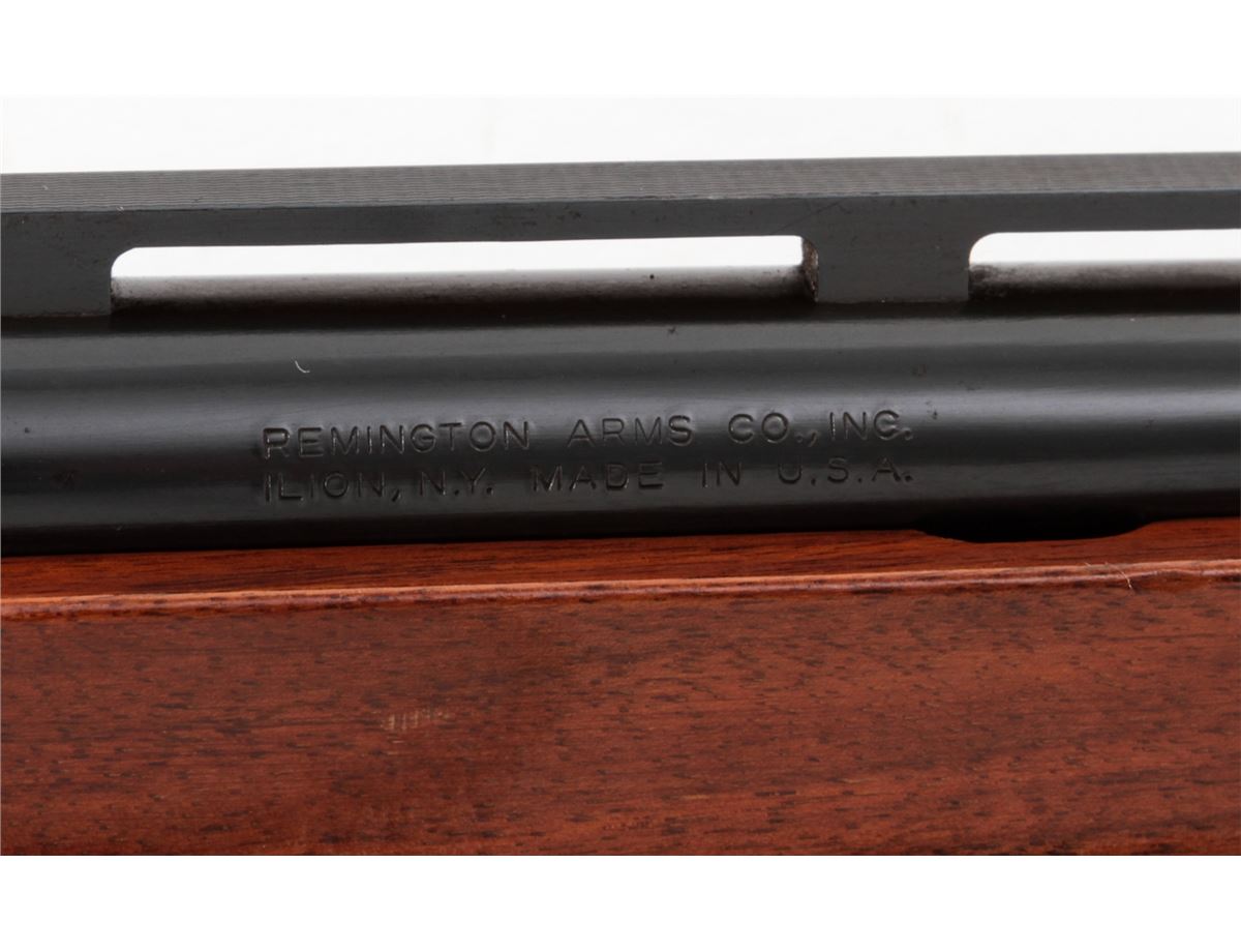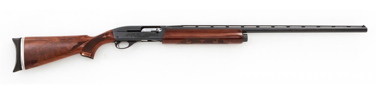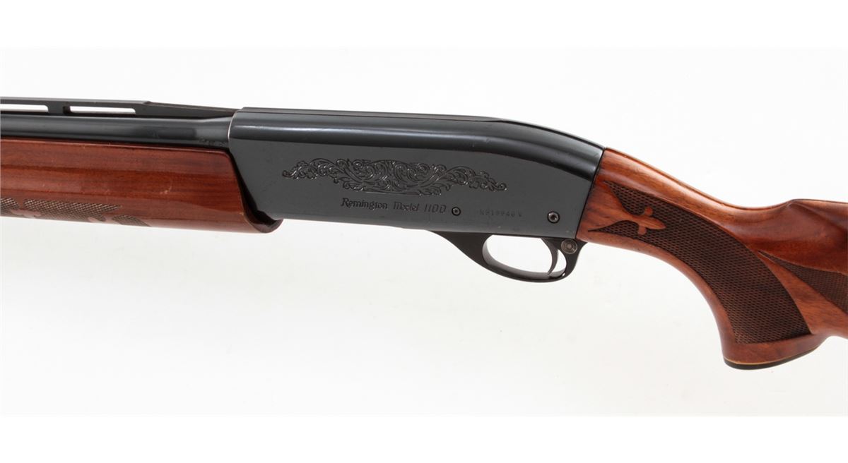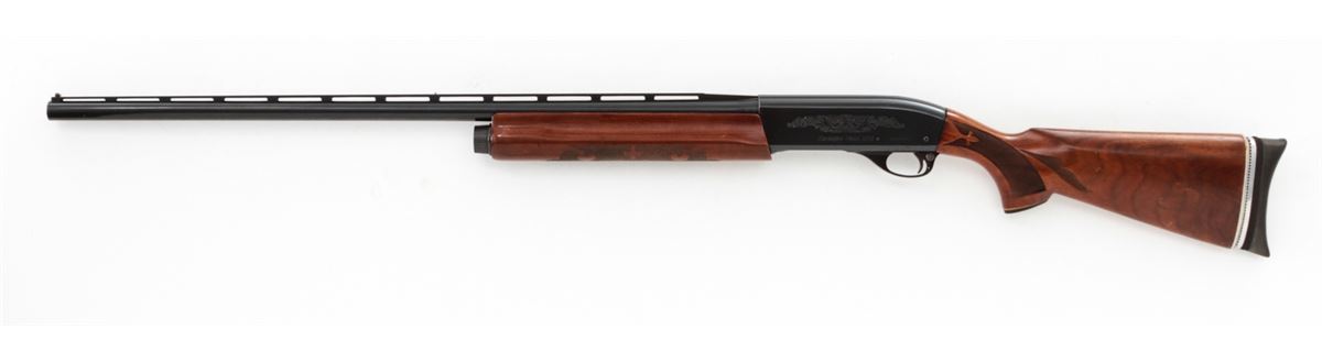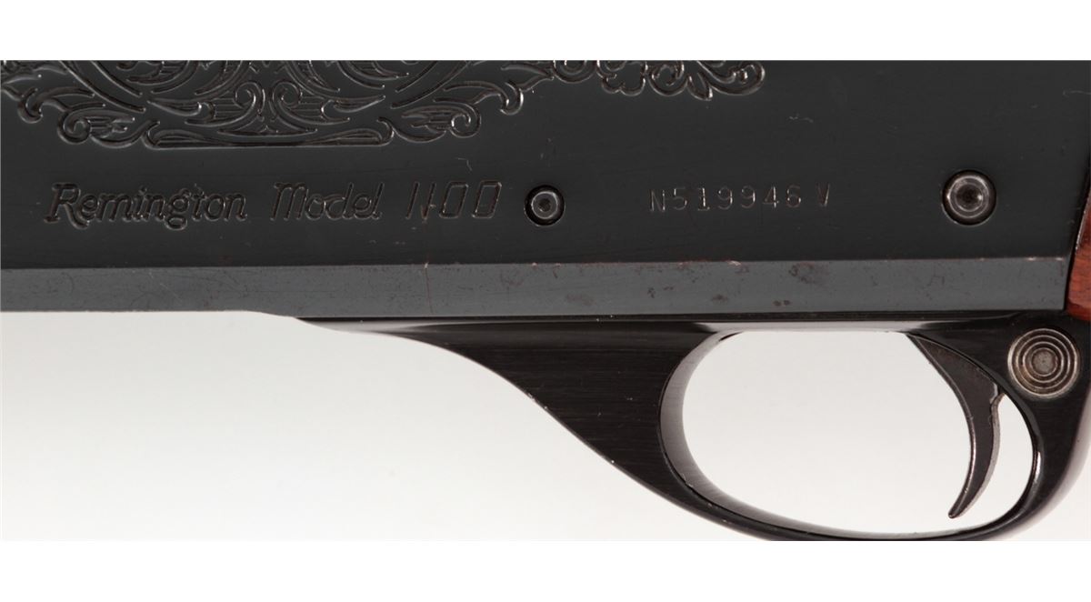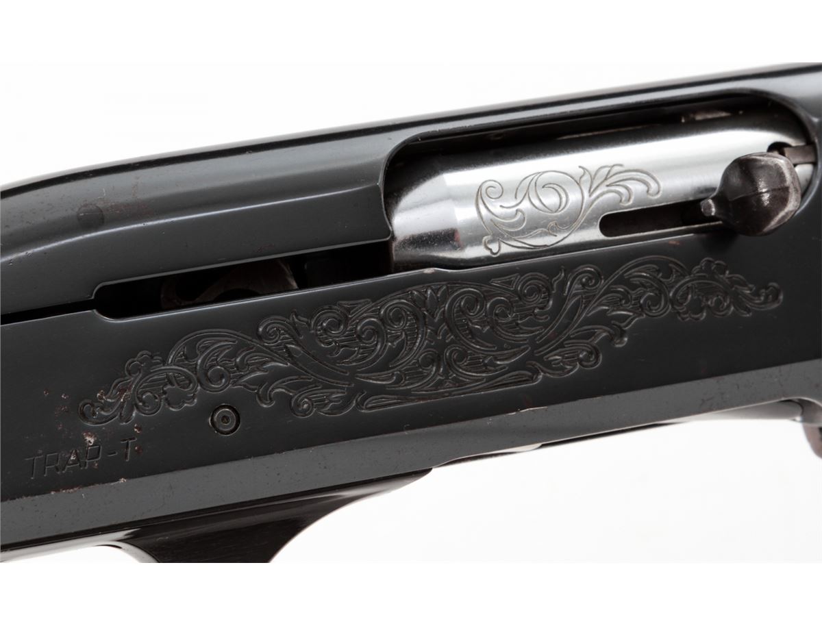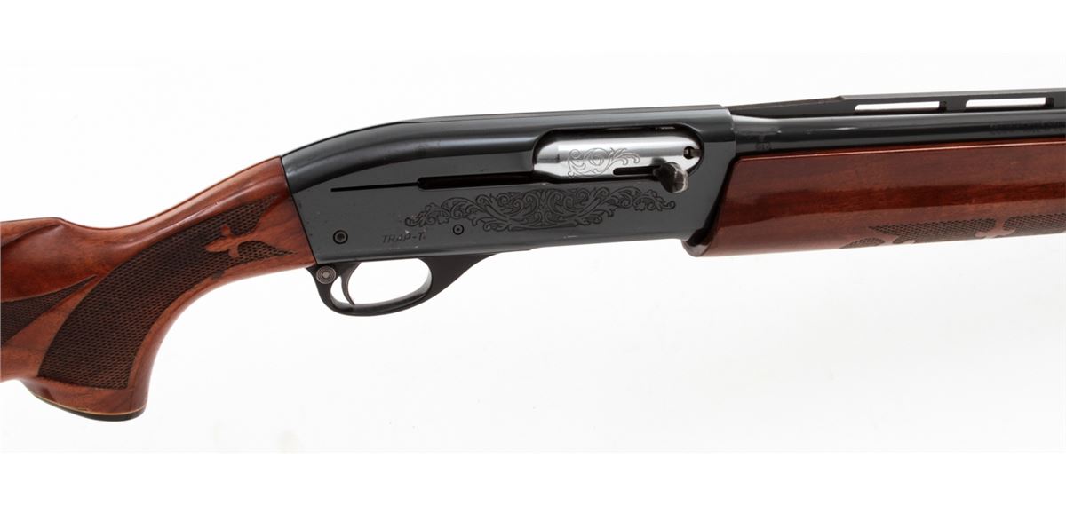 Remington Model 1100 Trap-T Semi-Automatic Shotgun, #N519946V, 12 ga., 30'' vent rib barrel choked Full for 2-3/4'' shells, blue finish, pressed checkered walnut stock, with adjustable butt pad. Condition is about fine showing light to moderate use, as light flaking to right side of receiver and small scattered pressure dings to stock and forend. Action remains crisp, bore is bright. Est.: $450-$600. (Modern)