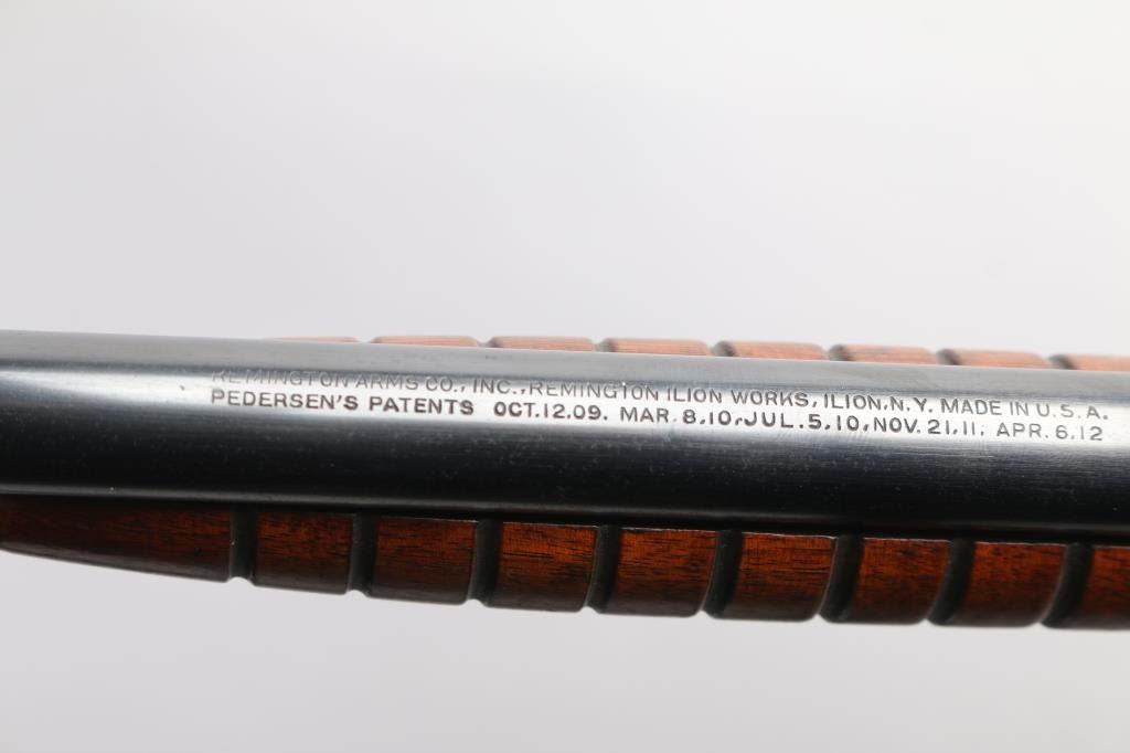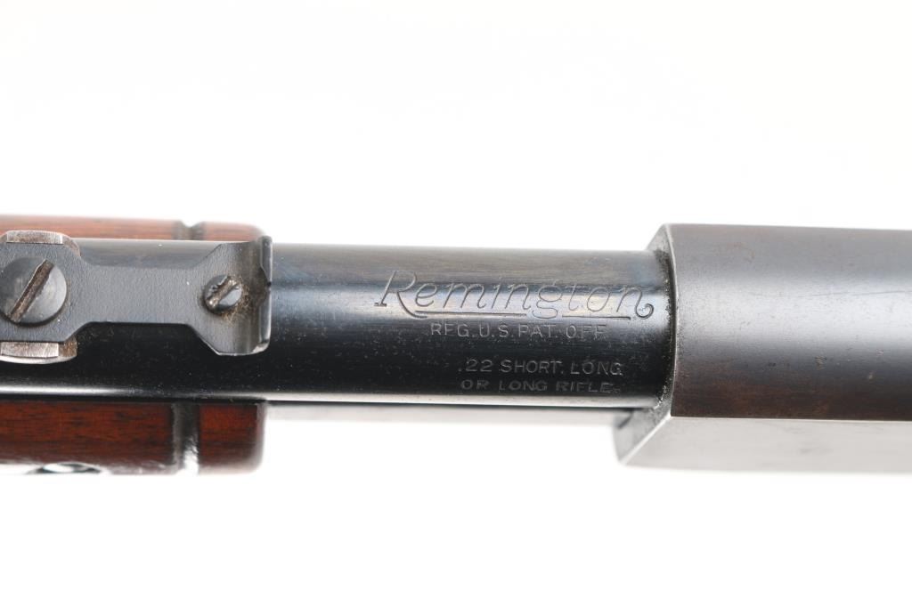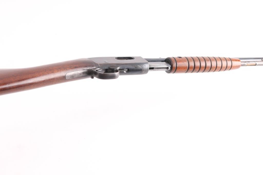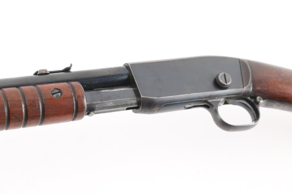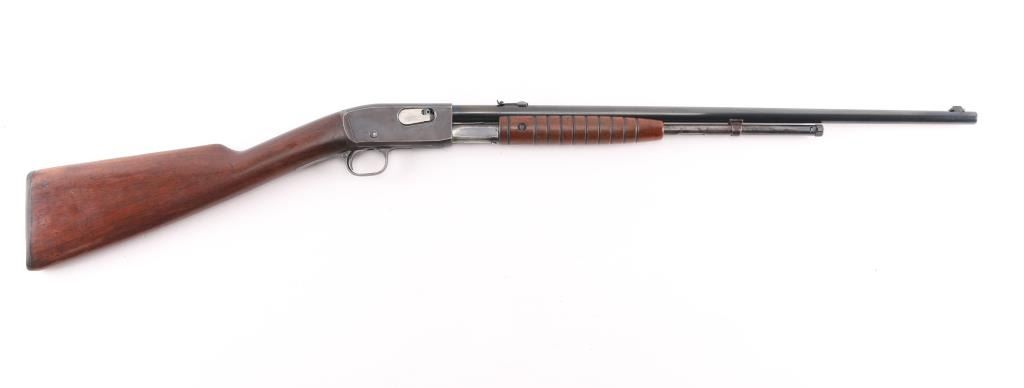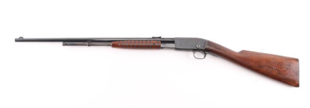 Vintage take-down slide action repeating rifle chambered for .22 Short, Long or Long Rifle. Manufactured 1911. Features a blued finish, 22" round barrel, dovetailed blade front sight with brass bead, adjustable rear sight, 2/3 length tube magazine, smooth trigger, concealed hammer, push button safety, take-down steel receiver, grooved walnut slide handle and smooth curved grip shoulder stock with factory hard rubber butt plate. Bore is excellent/bright. The barrel appears to have been reblued at some point, the receiver has edge wear, some handling loss on the lower tang, the tube has a molted gray finish with some blue remaining, action is smooth. Wood is very good/sound, minor scratches, some finish loss. Markings are generally crisp. Front sight appears to be a newer replacement.
