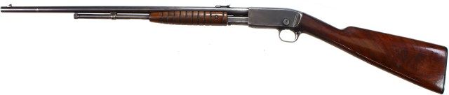pump action rifle 22" barrel, blued finish, walnut stocks. Overall very good condition, nice action and good bore. Modern. Est. 300-550