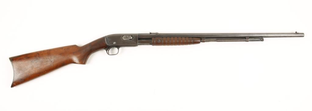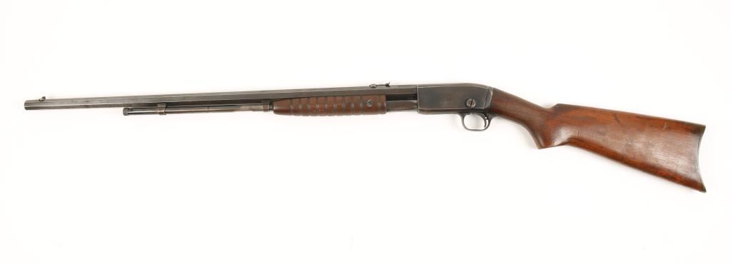 Slide-action tube fed breakdown .22 caliber rifle with a blued 23-1/4" octagonal barrel and walnut stock and slide. Bore is clean with no pitting and good rifling. The action is steel showing some wear, but is in good working order. Stock is in good condition with minor nicks and dings, but does have a chip missing at the top of the receiver. external bluing is in good shape with minimal wear. Overall, it is in Good condition. MODERN FIREARM