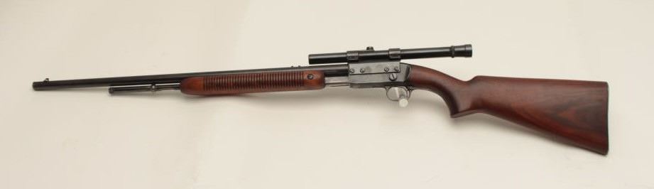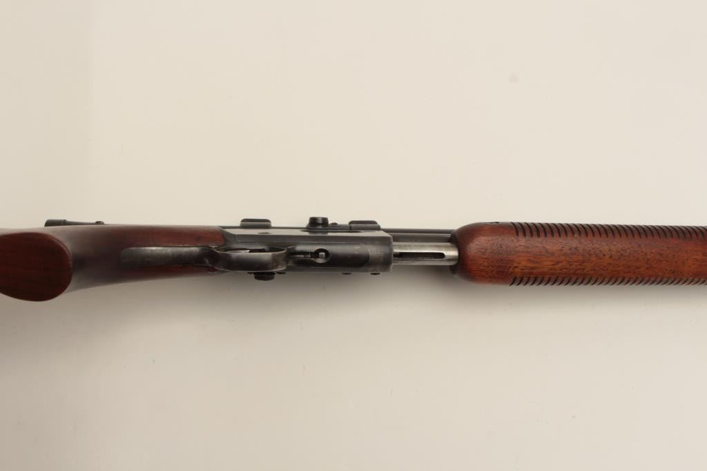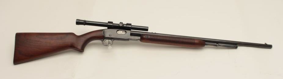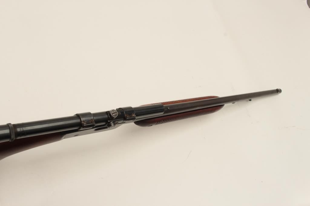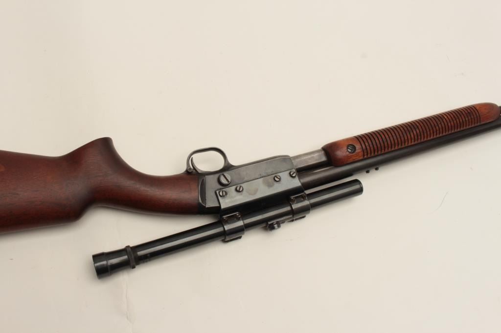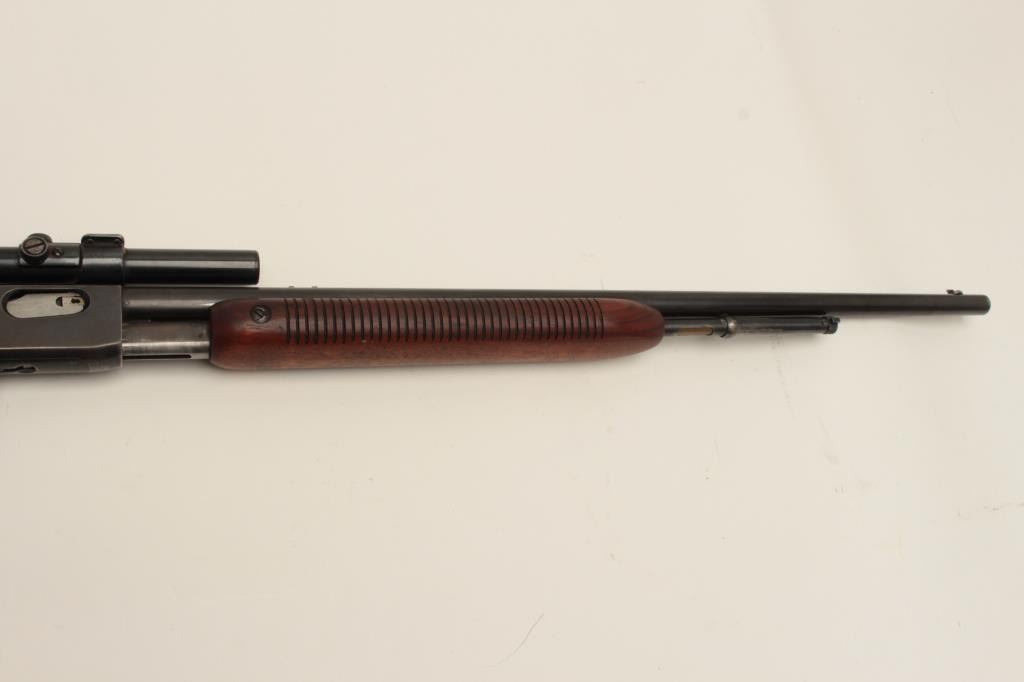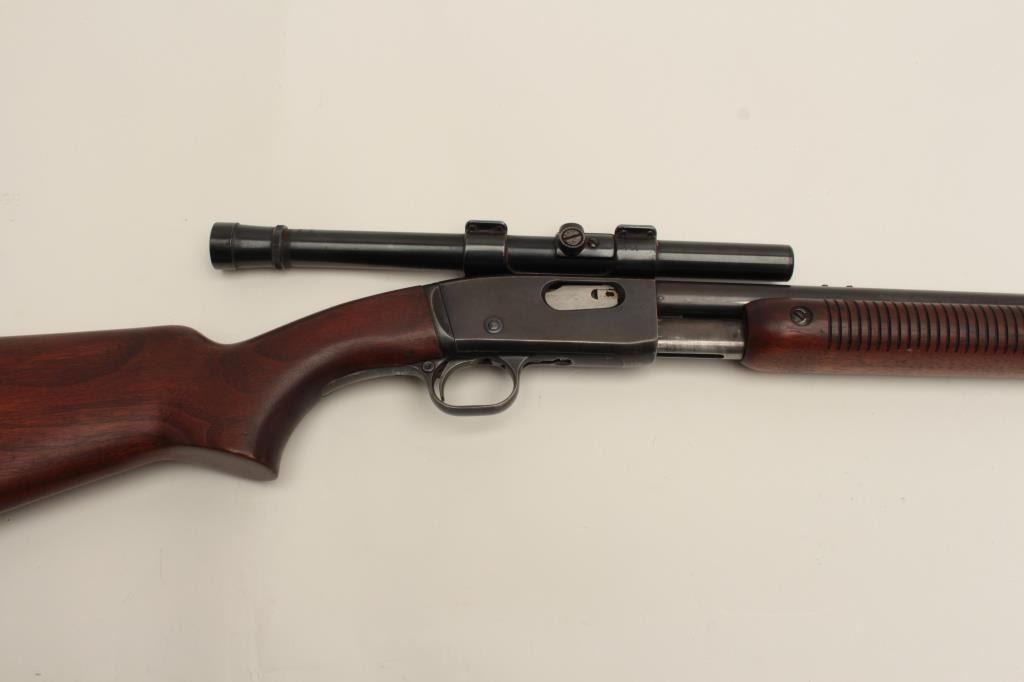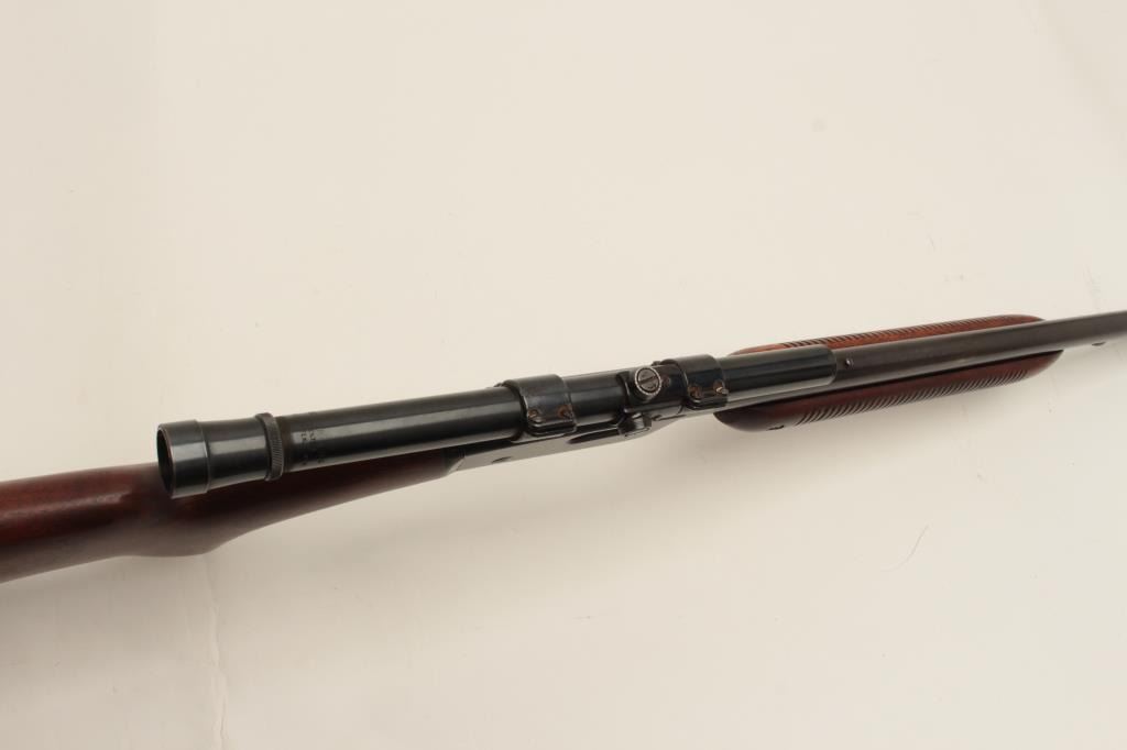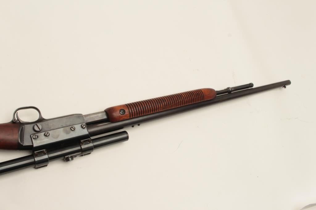 Remington Model 121 FieldMaster semi-automatic rifle, .22 short, long or LR caliber, 24” barrel, blued finish, wood stocks, S/N 1929, mounted with a Weaver scope displaying good optics. This rifle is inoverall good condition with lots of original muted blue, good action and markings, good to very good wood; consignor notes barrel has a slight bulge (we had hard time seeing it) but “still shoots very well”. (C&R/NoPPT). Est.: $125-$250.