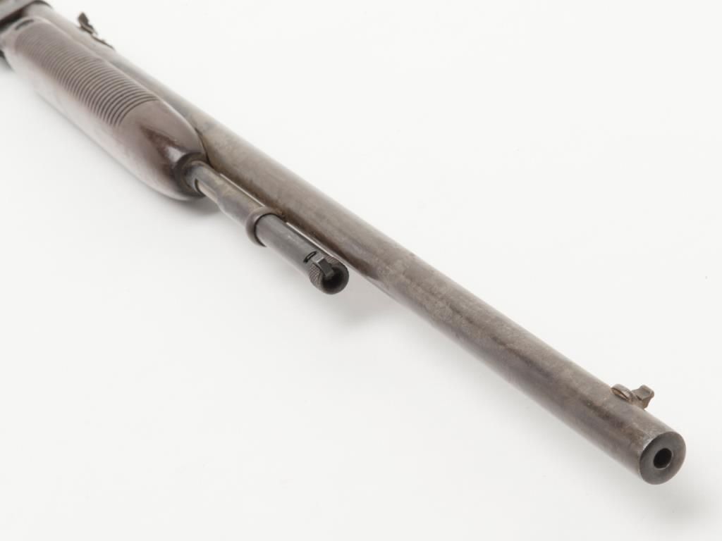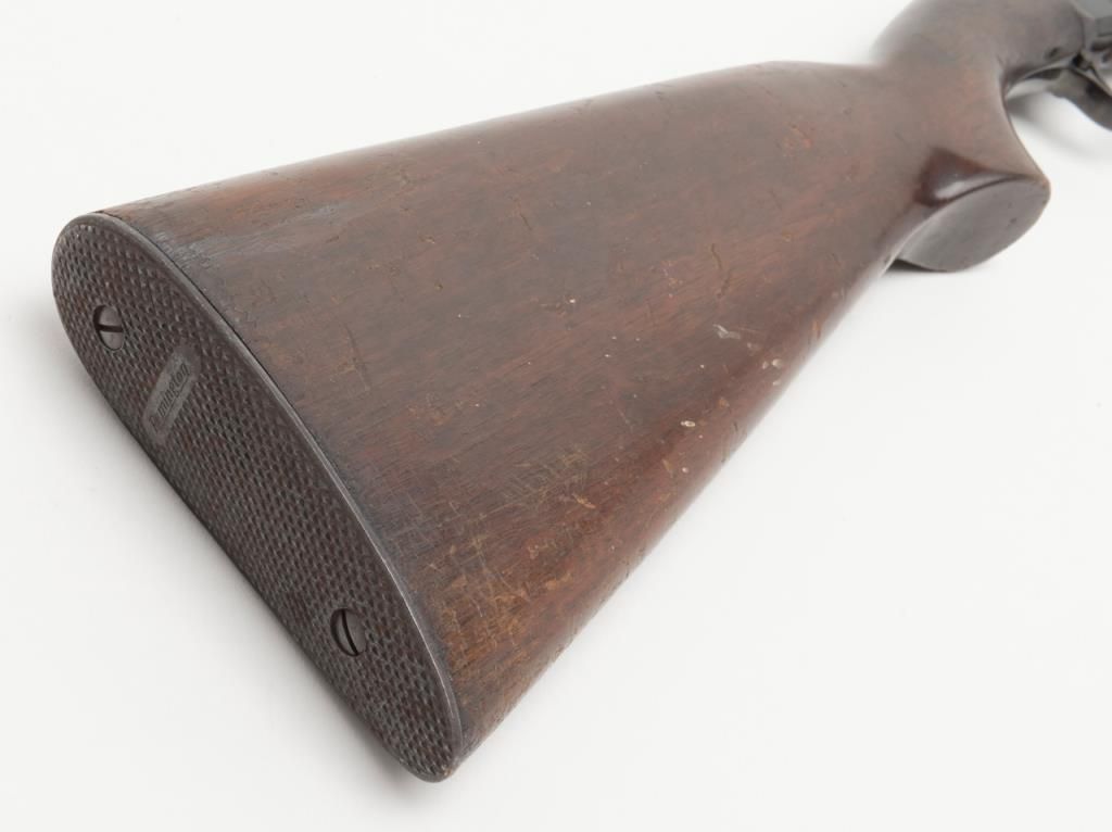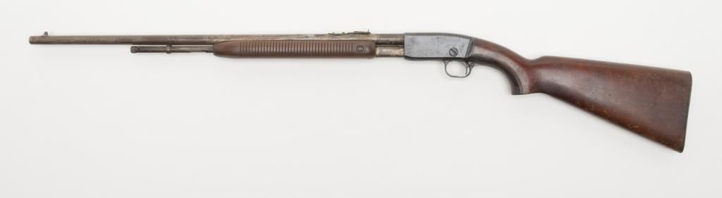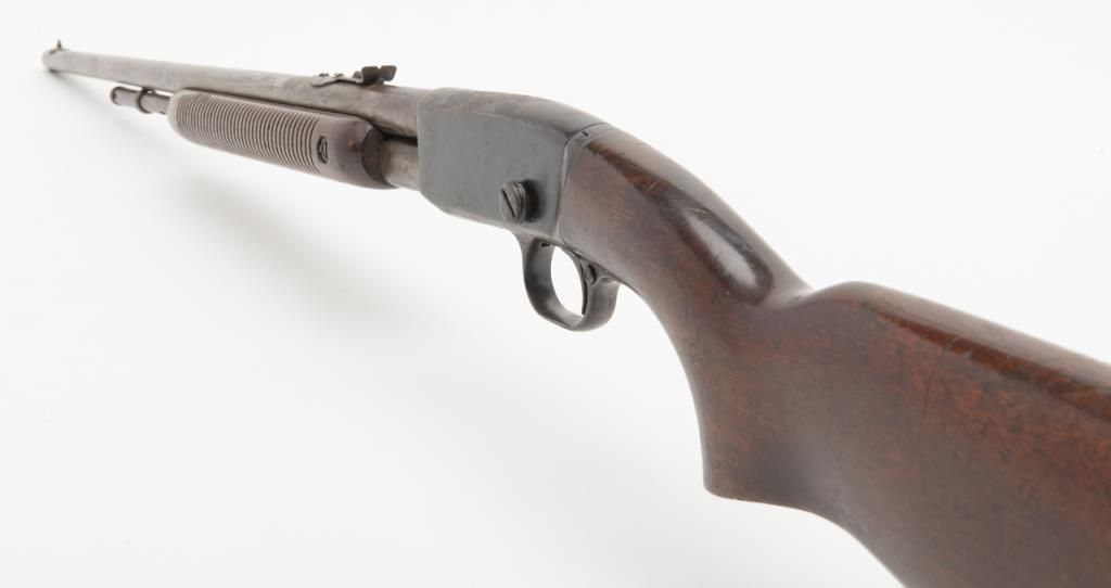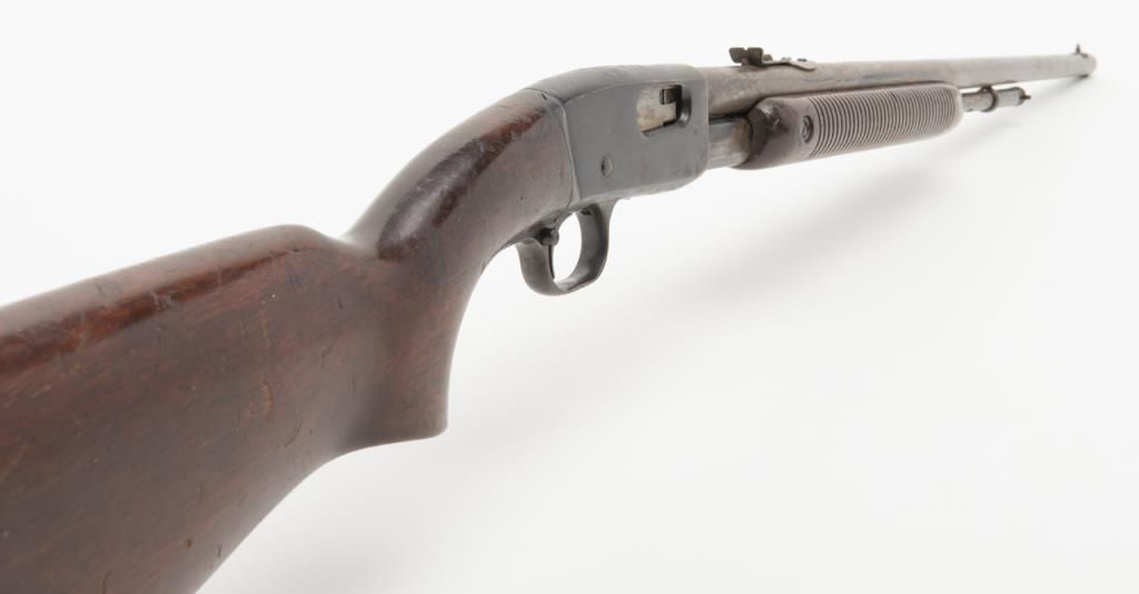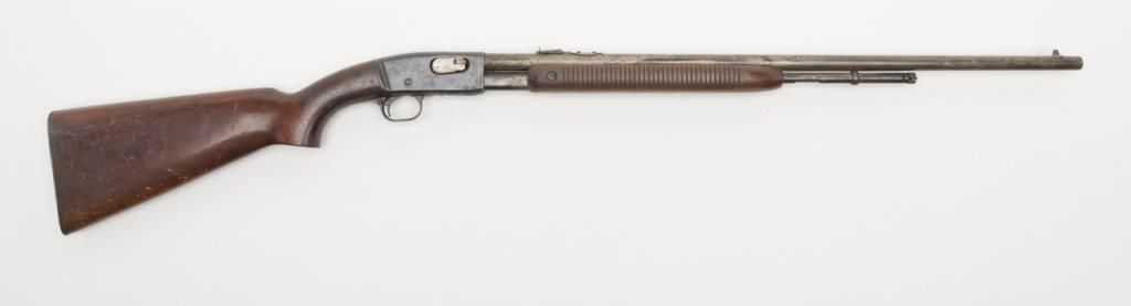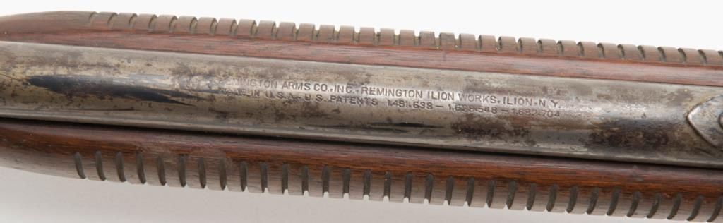 Remington Model 121 Takedown pump action rifle, .22 Short, Long or Long Rifle caliber, Serial #68153. The rifle is in overall fair condition with a 24” barrel. The barrel and magazine retain blue only in the protected areas with the barrelhaving a speckled appearance someone having applied some cold blue rather poorly. The receiver retains the majority of an old re-blue. The smooth wood stocks are in overall good condition with mars from use and a checkered metal Remington marked butt plate. The bore is good and action crisp on this old gun. (C+R/PPT). Est.: $150-$300.