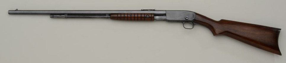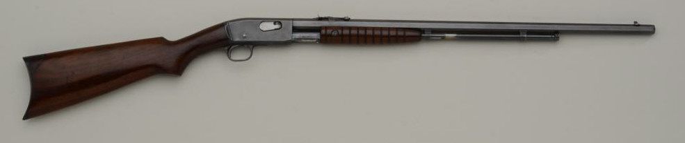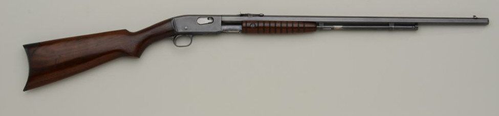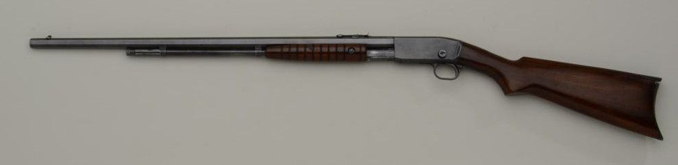 Remington Model 12C .22 short, long, or long rifle with desirable 24” factory octagon barrel, serial number 567519. This Remington shows 80% to 90% original blue thinning at the edges and operating areas of slide. Thewood is very good plus with a few dings, mars and minor scratches. The Remington shows just normal minor use. The original rear sight and elevator are retained along with original front sight. The action is good, the bore is very good plus and may clean to excellent. Est.: $400-$800.