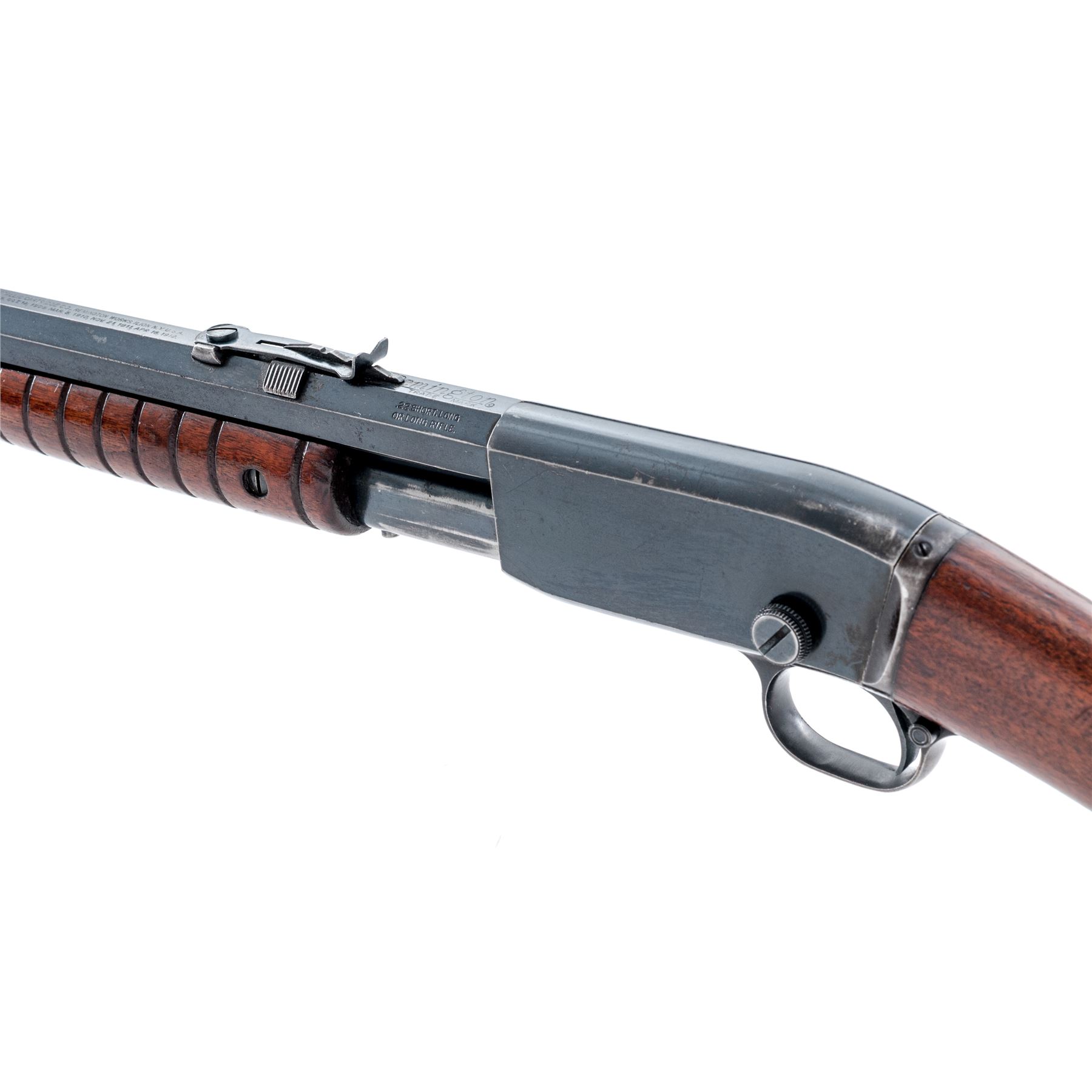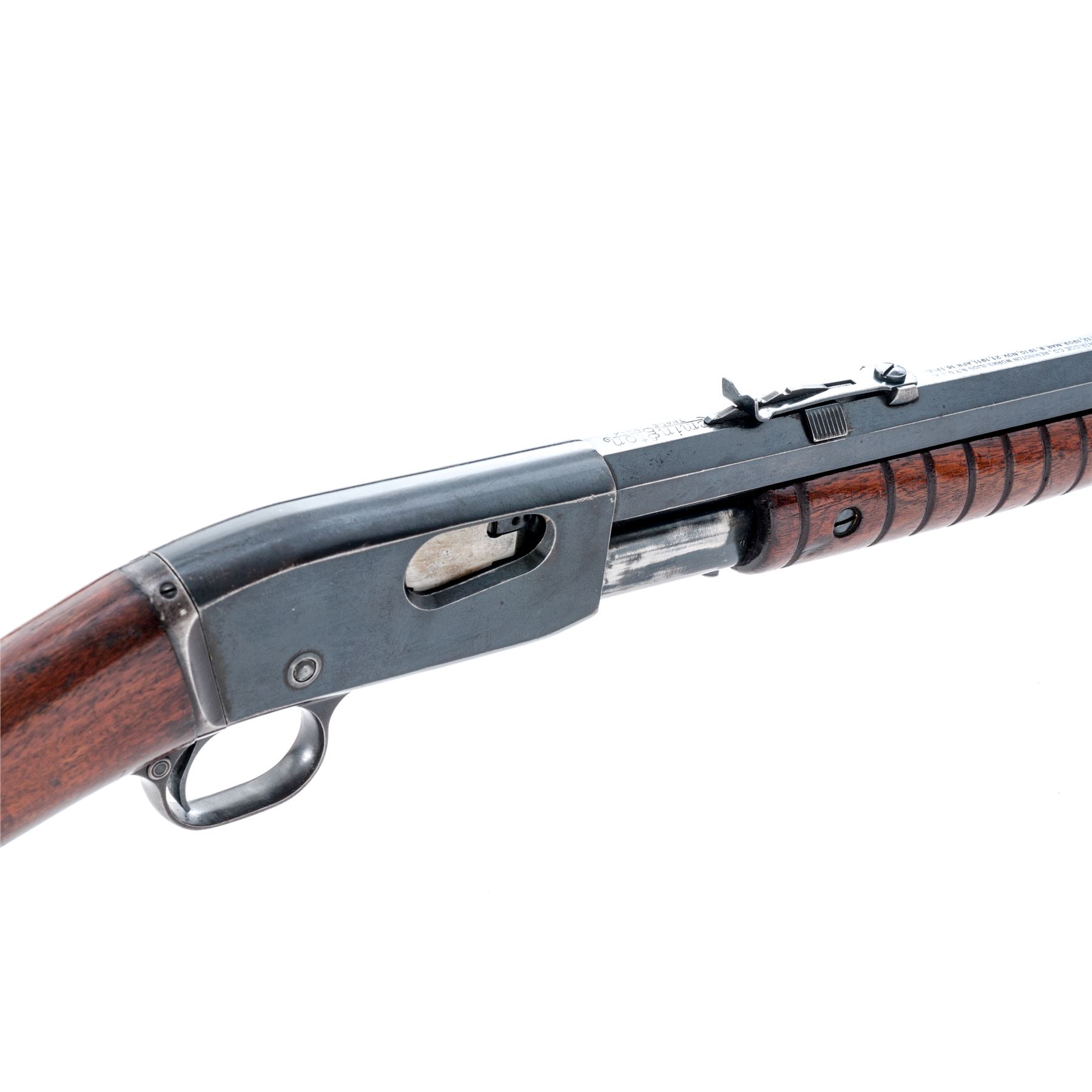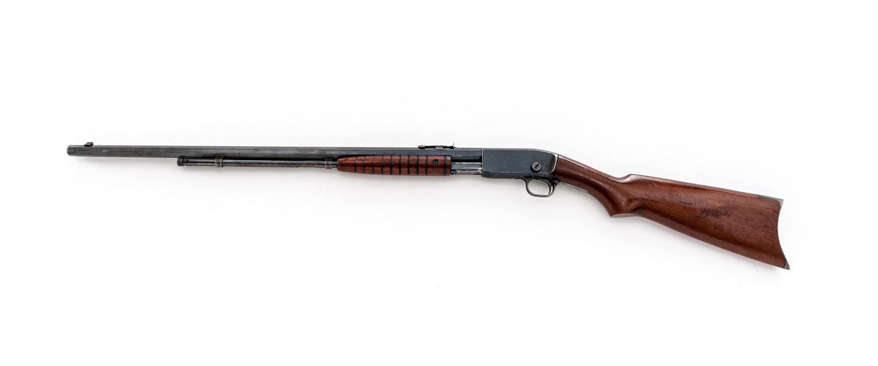 Remington Model 12C Slide-Action Rifle, #338503, .22 S-L-LR cal., 24'' octagonal barrel, blue finish, pistol-grip walnut stock and grooved forend, crescent steel Remington UMC buttplate, dovetailed silver beaded blade front sight and notched rear sight with elevator. Barrel is marked ''REMINGTON ARMS-UNION METALLIC CARTRIDGE CO., REMINGTON WORKS, ILION, N.Y. U.S.A.'' with patent dates and other standard markings; with ''Remington UMC'' on the lower tang. Condition is very good retaining approx. 85% original finish, thinning and toning to the magazine tube and lower tang account for a majority of the finish loss; barrel address and other factory lettering is clear and defined. Wood with general mostly small handling marks and normal signs of age and field wear, approx. 85% varnish remains with some thinning and flaking, predominantly at the forend and grip. Smooth crisp action; bore with a little fine spotted erosion, good rifling. Est.: $300-$500. (C&R)