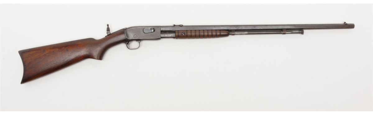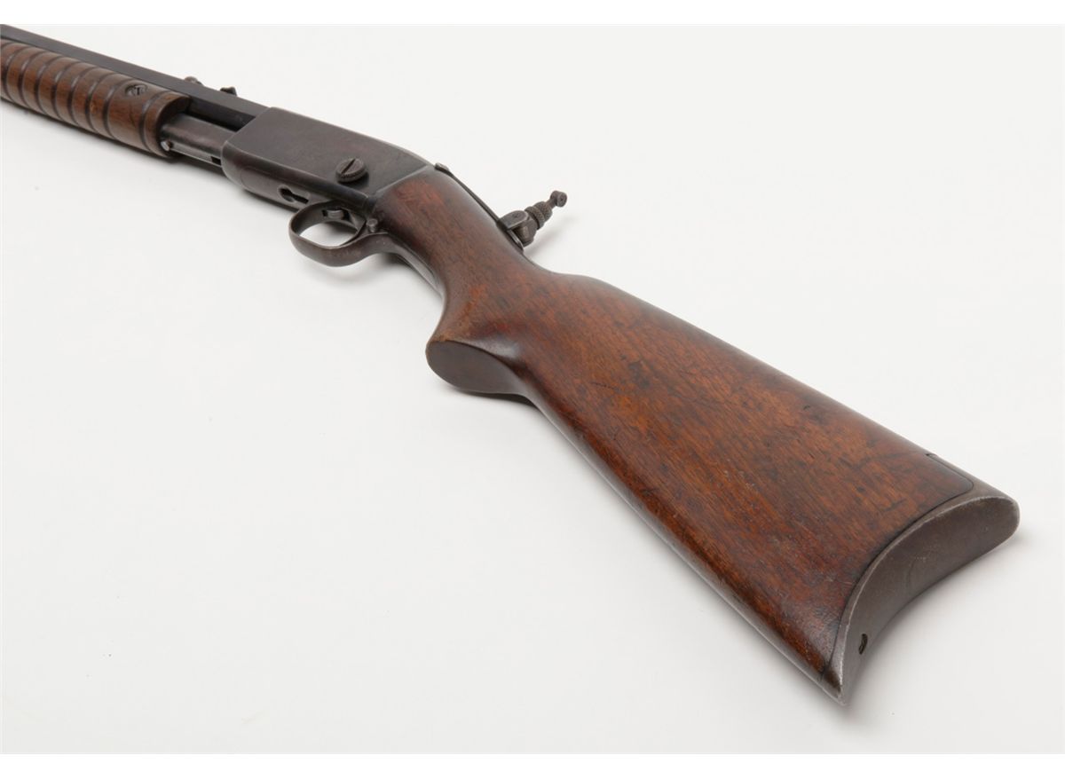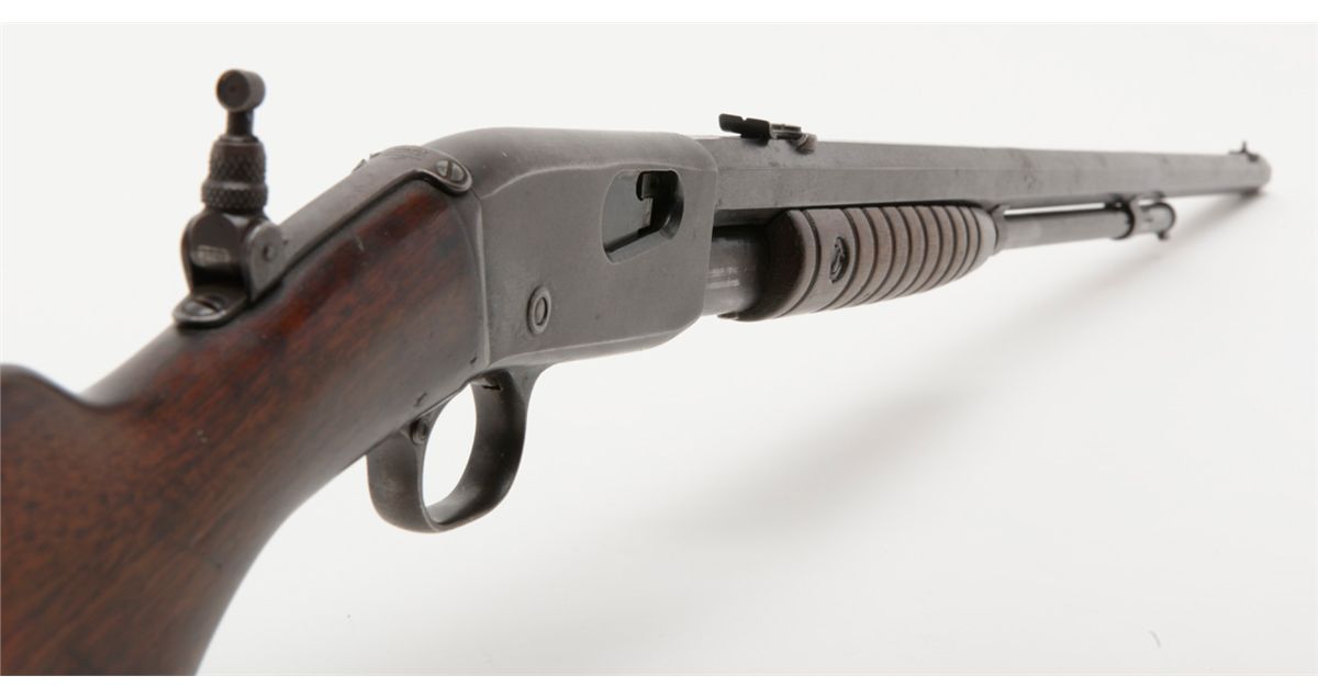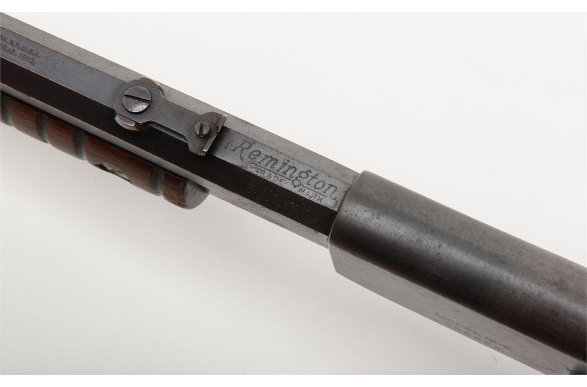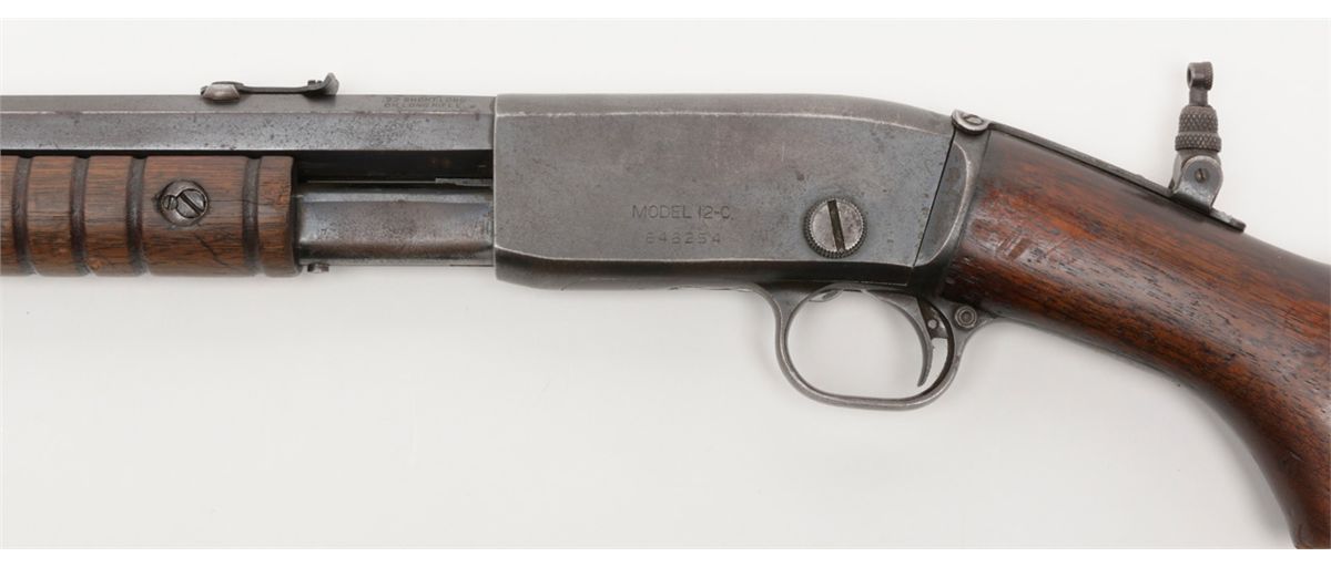 Remington Model 12C Takedown pump action rifle, cal. .22 Long Rifle, Long or Short, Serial #646254. The rifle is in overall very good condition with a 24" blued barrel. The stocks are in good condition with normal mars andcompressions consistent with use. The rifle retains some blue in protected areas with the remainder going to plum patina, while the action is crisp, edges sharp and the markings are legible. The rifle ends in its original metal,crescent butt plate. A Marble tang sight has been added during the period of use. (C+R/PPT). Est.: $275-$550.