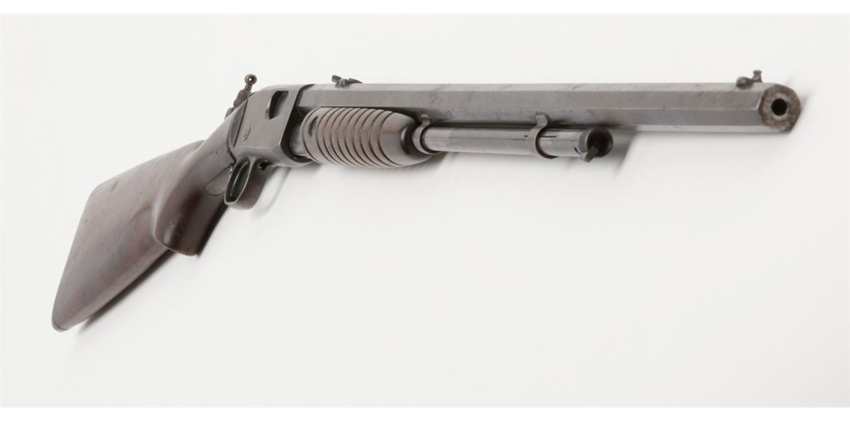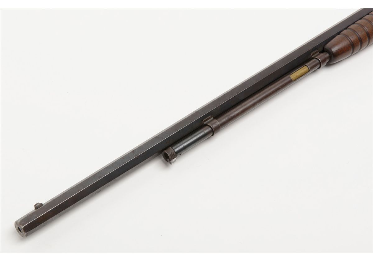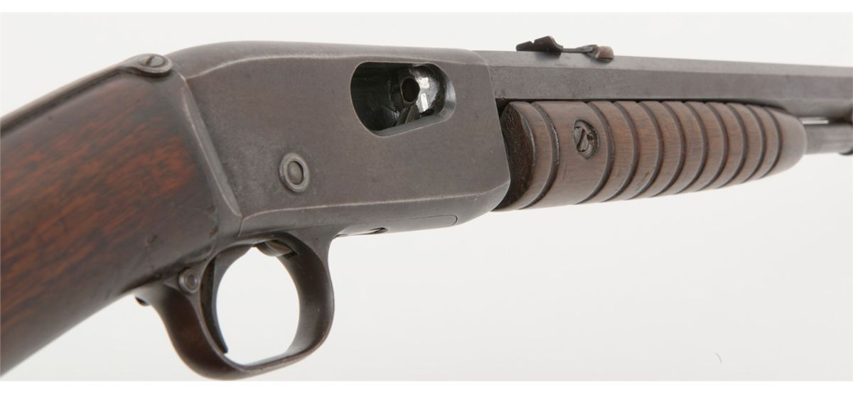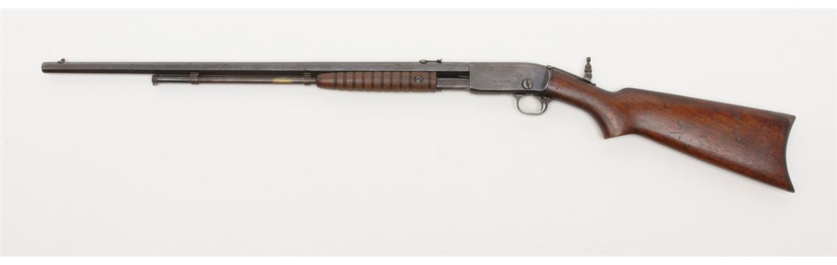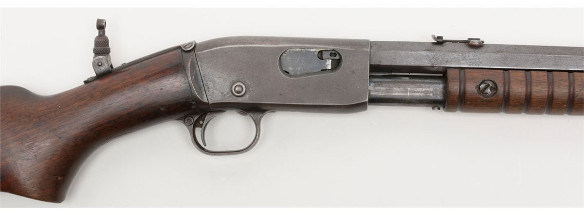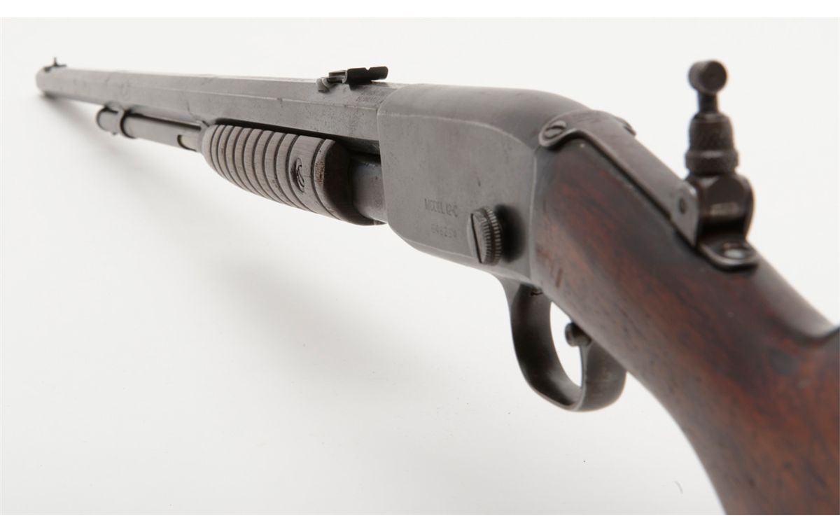 Remington Model 12C Takedown pump action rifle, cal. .22 Long Rifle, Long or Short, Serial #646254. The rifle is in overall very good condition with a 24" blued barrel. The stocks are in good condition with normal mars andcompressions consistent with use. The rifle retains some blue in protected areas with the remainder going to plum patina, while the action is crisp, edges sharp and the markings are legible. The rifle ends in its original metal,crescent butt plate. A Marble tang sight has been added during the period of use. (C+R/PPT). Est.: $275-$550.