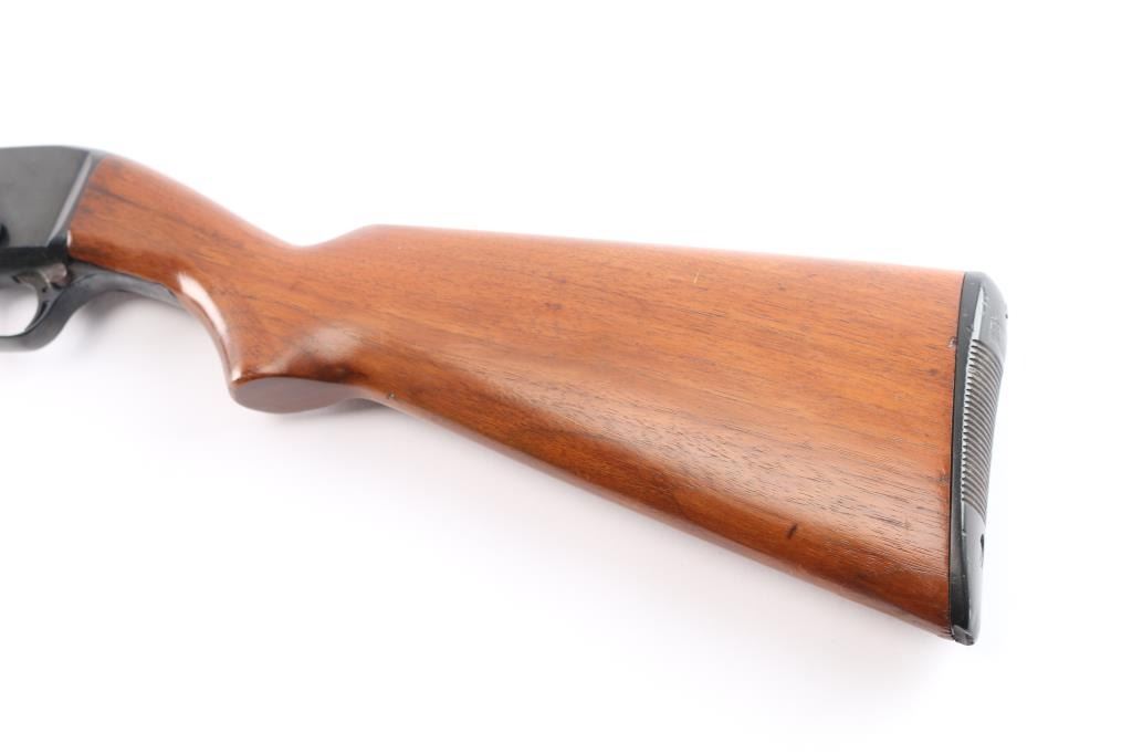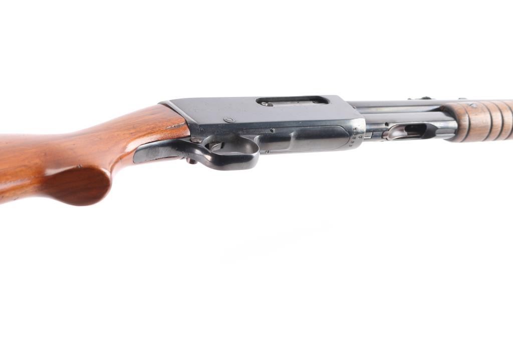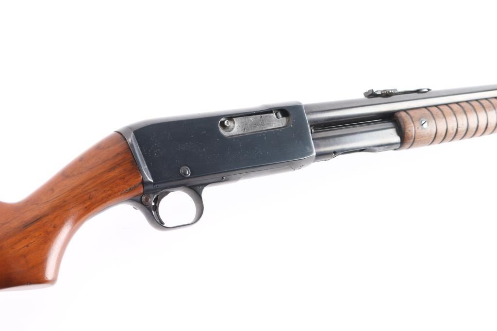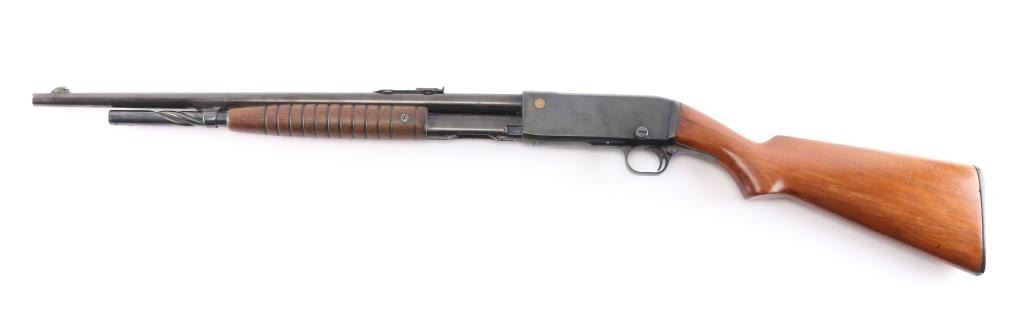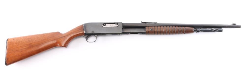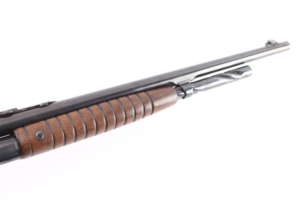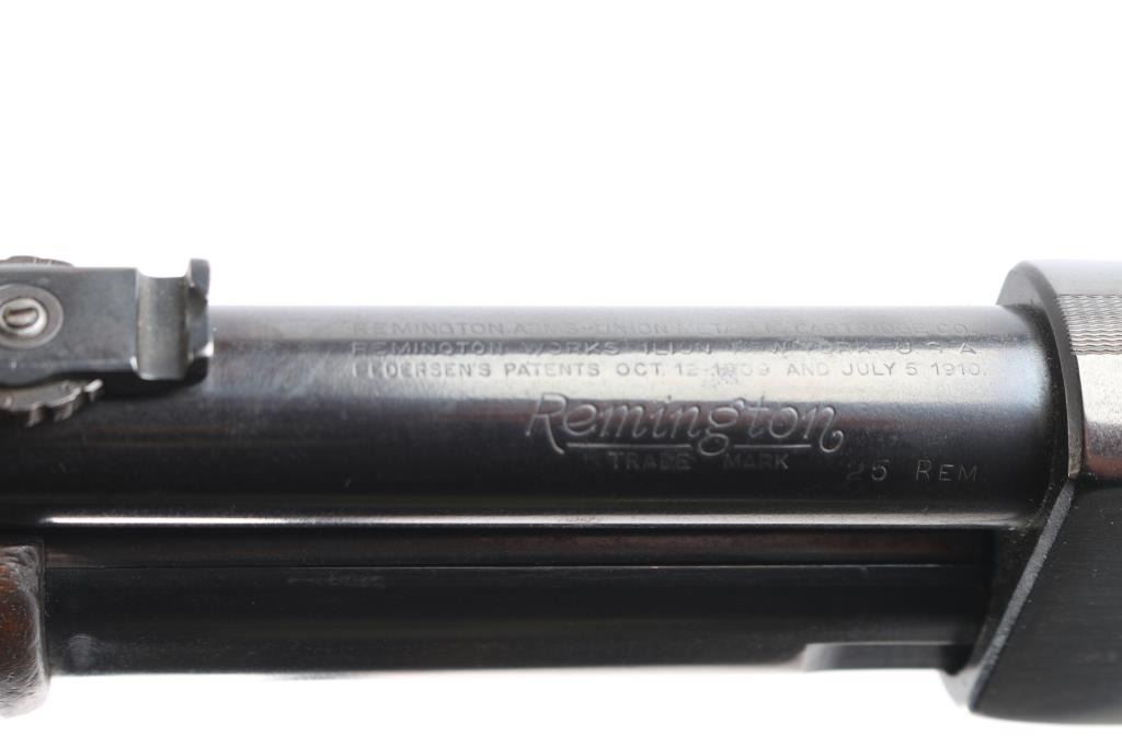 Remington Model 14 take down pump action rifle in 25 Remington caliber with 20 1/2" barrel # 16853. Refinished overall and remaining in very good as refinished condition, markings are legible and action works well with good bore.