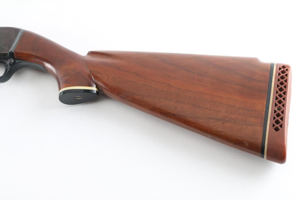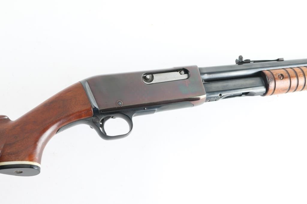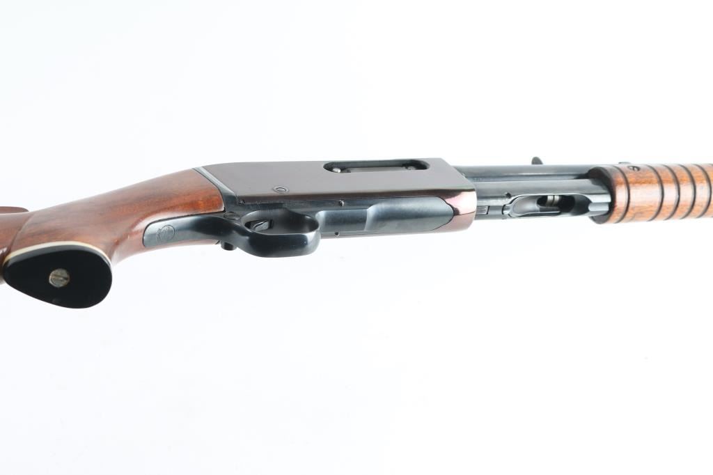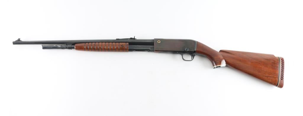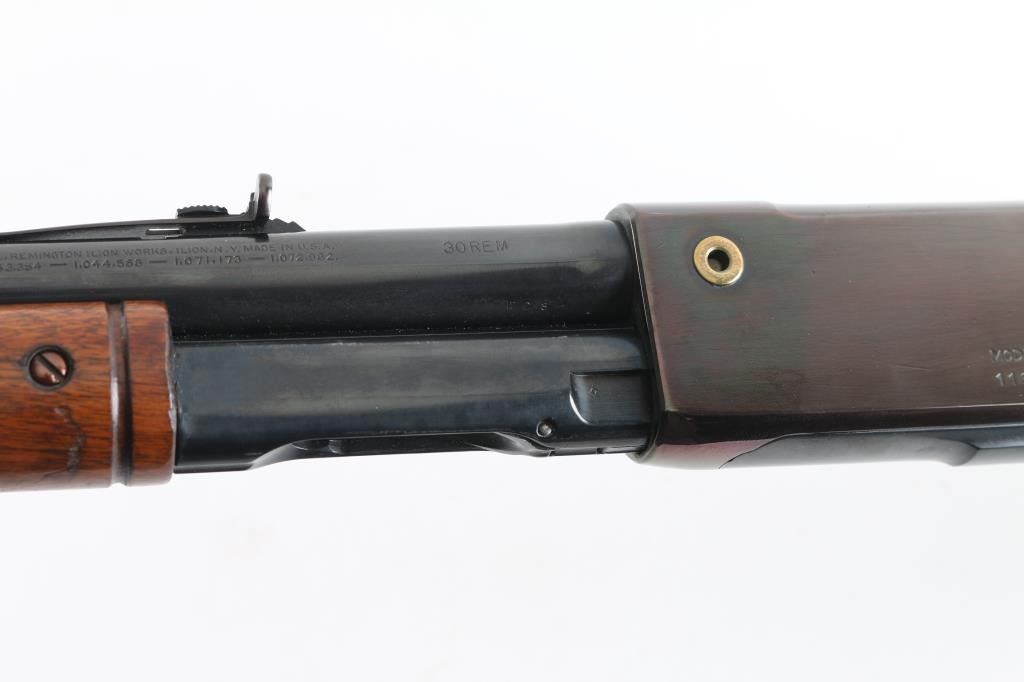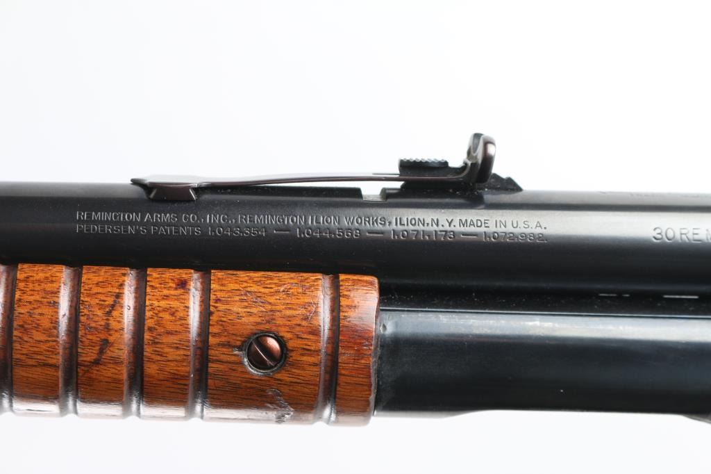 Vintage (1913-34) take-down slide action repeating rifle chambered in .30 Remington. Features a blued finish, 22" tapered barrel, dovetailed post/bead front sight and elevation adjustable sporting rear sight, Tube magazine, smooth trigger, concealed hammer, push button safety, take-down receiver, grooved walnut slide handle and pistol grip shoulder stock with Remington recoil pad, grip cap, with white spacers. "Rem-UMC" case head insert on left receiver has been buffed out. Bore is very good. Rifle has been refinished, with a newer buttstock, re-blued metal finish is very good, same for the plum colored receiver. Receiver drilled/tapped for optics. NRA Condition-Very Good, as Refinished. C&R Firearm.