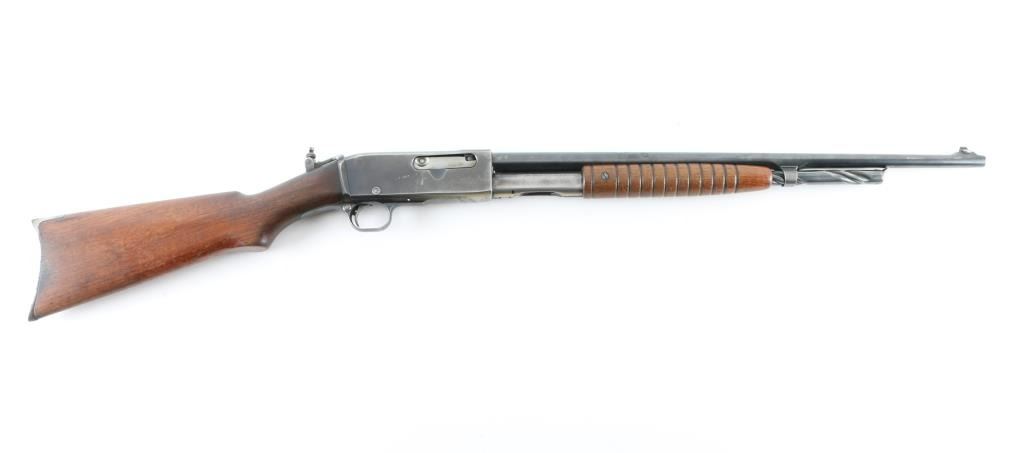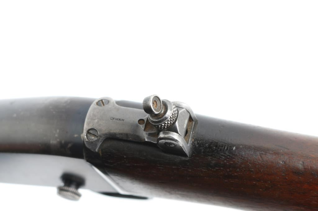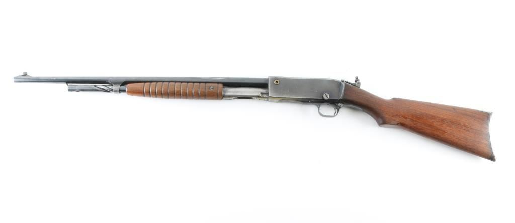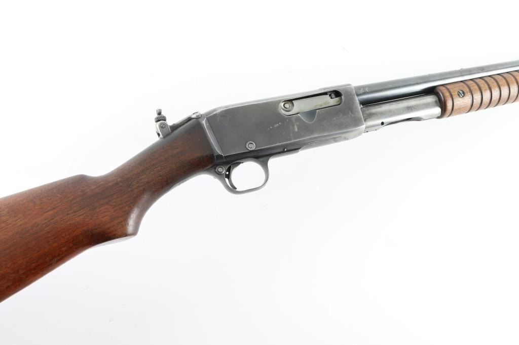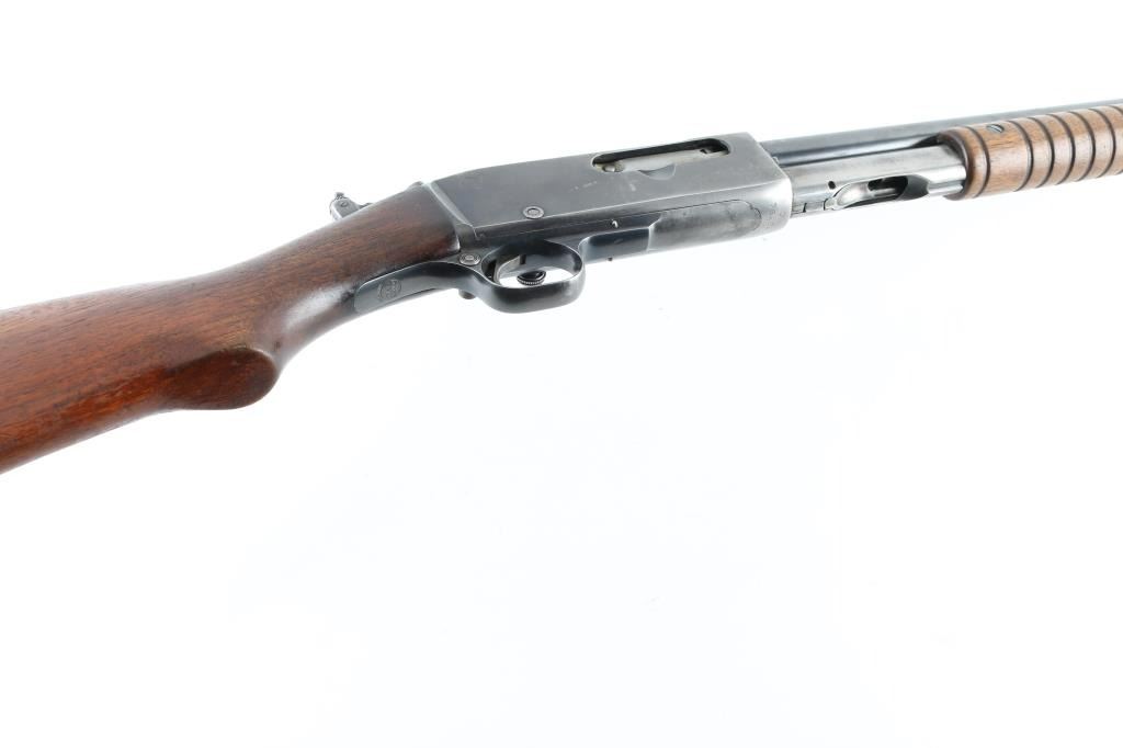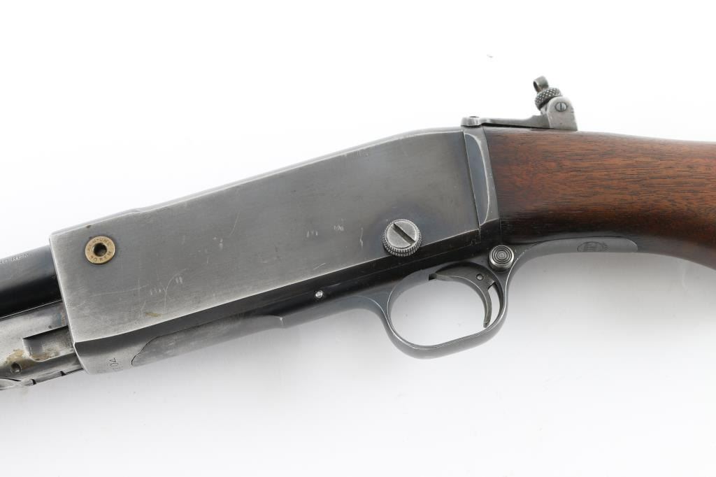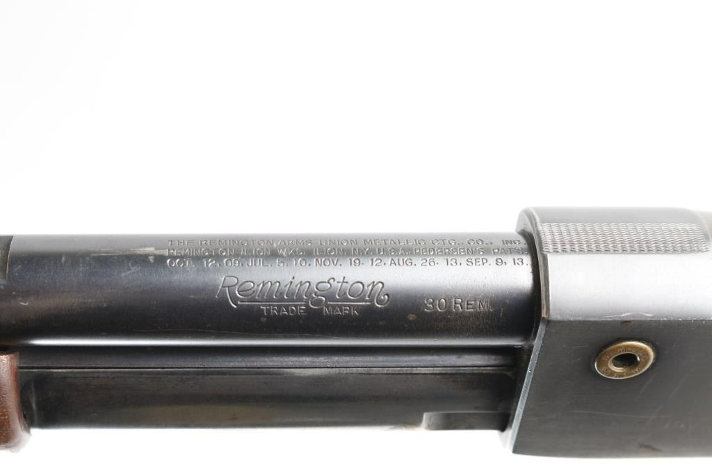 Vintage slide action rifle chambered for .30 Remington ammunition, manufactured circa 1920. It features a 22" blued barrel and receiver with a dovetailed No. 3 Marble front sight and a Lyman rear peep sight. Empty dovetails in the barrel where factory sights were removed. Wood pump handle with grooves. Smooth wood stock with Remington UMC metal butt plate. The barrel and receiver show quite a loss of blue with a few scrapes and dings as well. The wood looks pretty good with no cracks at the wrist but one very small crack at the back from the wood drying out. The metal butt plate has some rust. Bore looks good but needs cleaned. LOP is 14.25". Condition is NRA Good. *C&R Firearm*