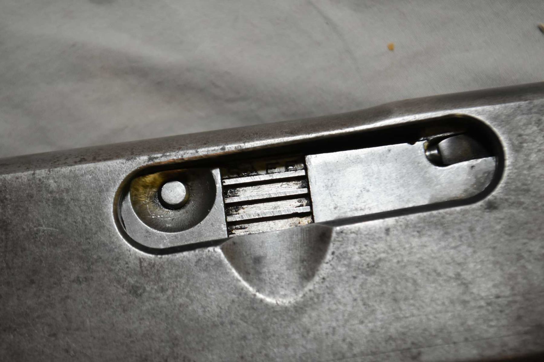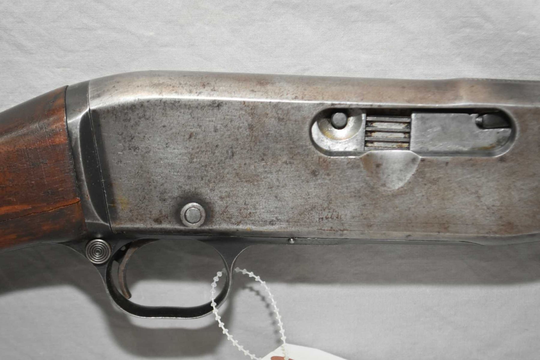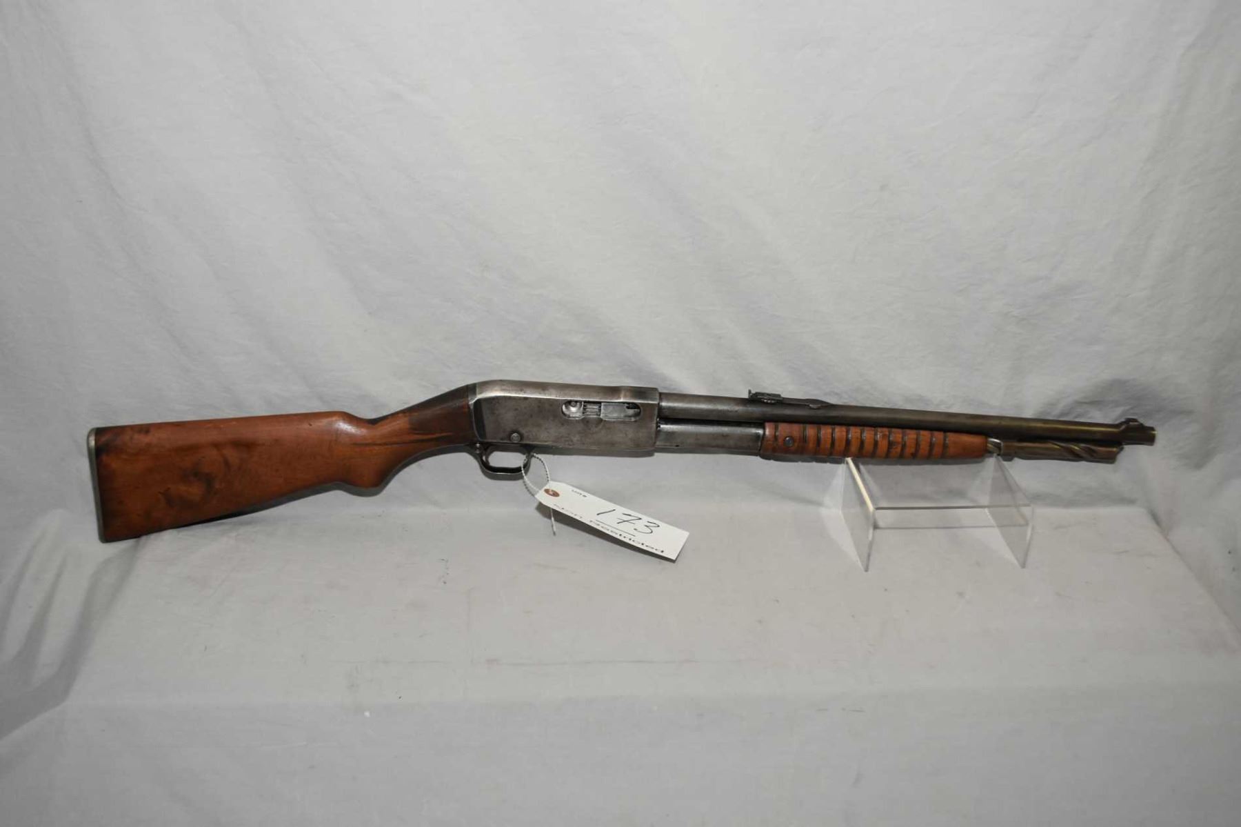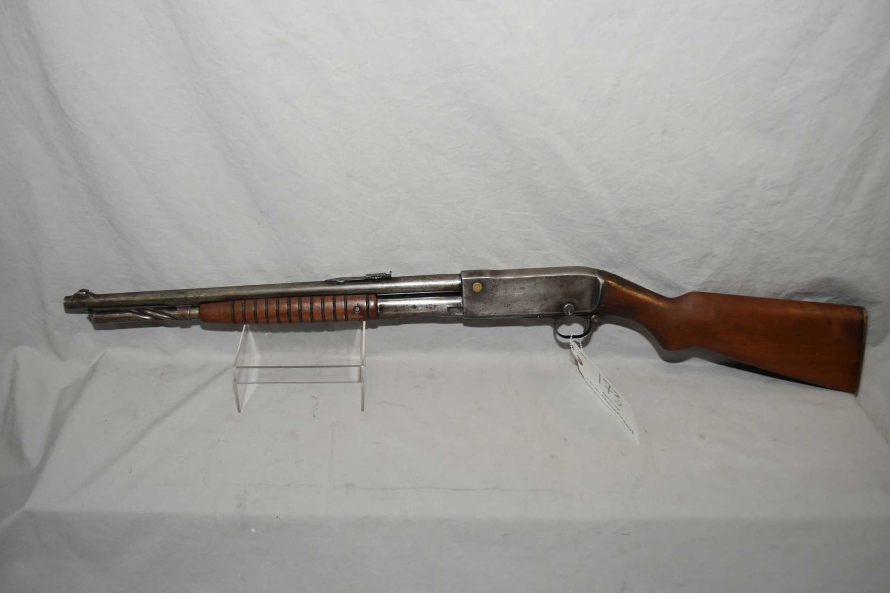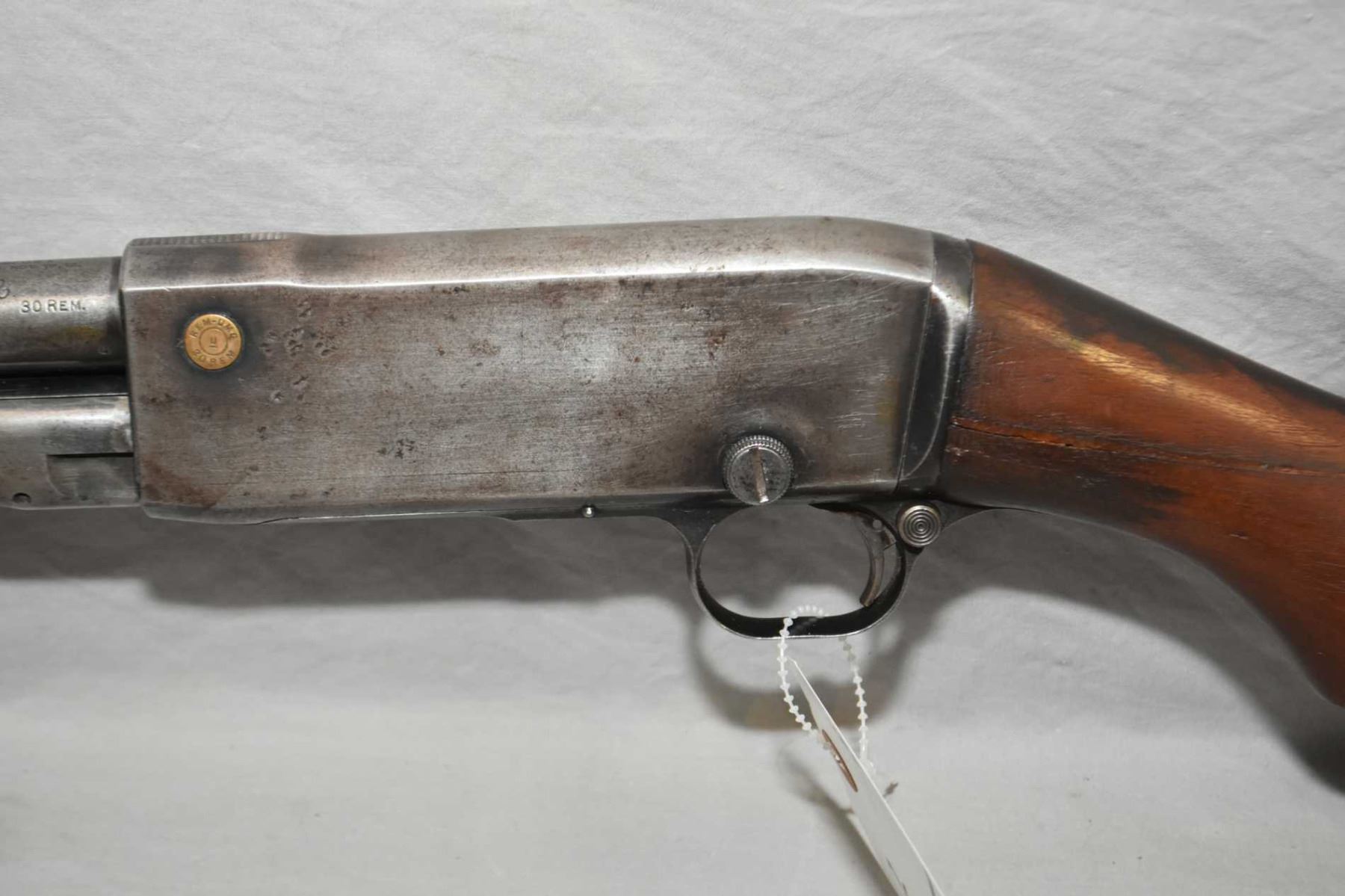 Remington Model 14 R .30 Rem Cal Tube Fed Pump Action Carbine w/ 18 1/2" bbl [ traces of blue finish fading to brown in some areas, patchy with marks and scratches, bolt safety, barrel sights, cracked and repaired grooved forend, cracked behind receiver on plain pistol grip stock, swivel screw holes filled in, checkered Remington UMC butt plate ] Ser # C63148