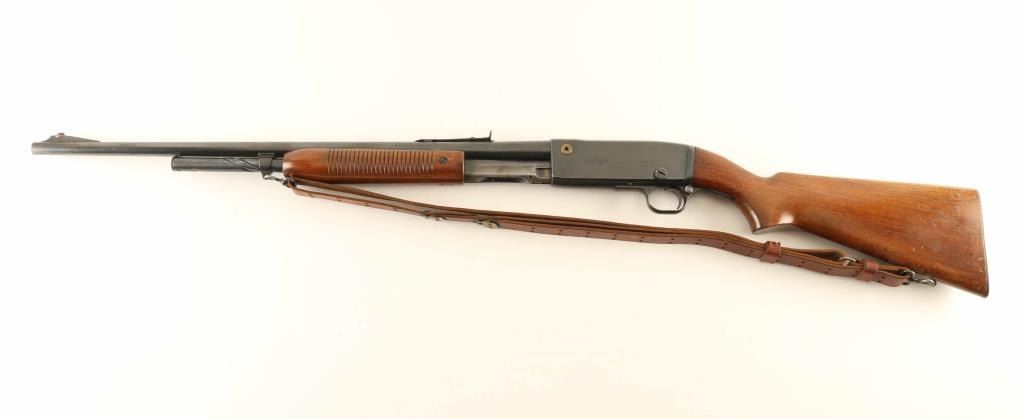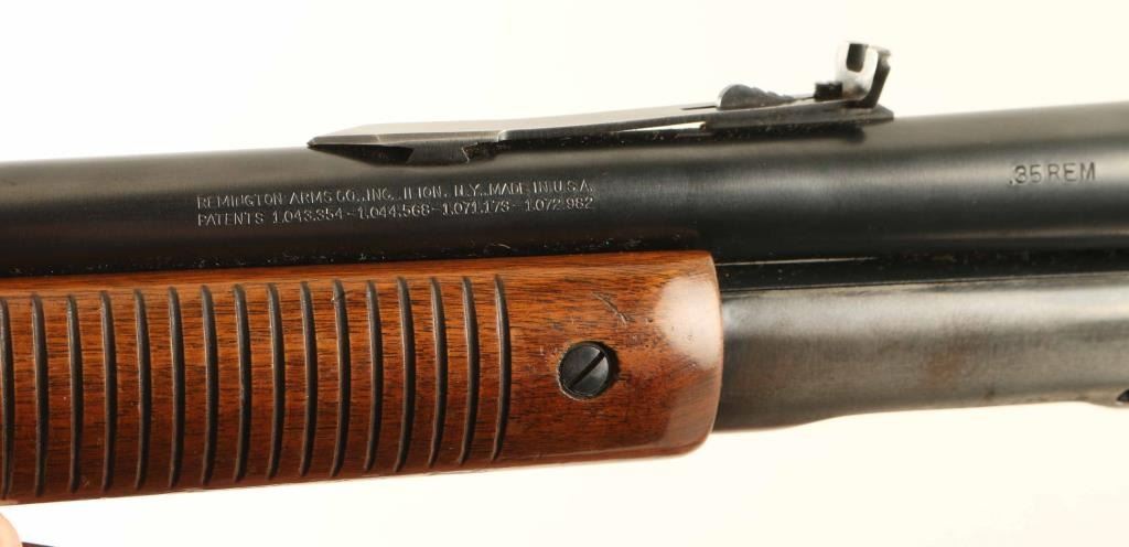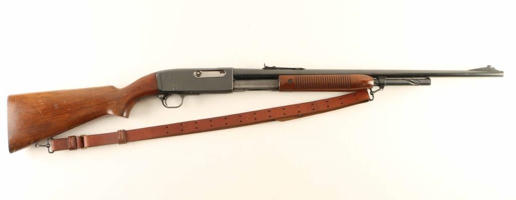 'The Gamemaster' Vintage take-down slide action repeating rifle chambered in .35 Remington, manufactured circa 1948. Features a blued finish, 24" tapered barrel, ramped Marble 50 dovetailed blade front sight with brass bead, elevation adjustable rear sporting sight, 3/4 length tube magazine, smooth case hardened trigger, push button safety, steel take-down receiver with factory drilled & tapped rear portion, smooth brown leather sling, grooved walnut slide handle and smooth pistol grip shoulder stock with factory knurled metal buttplate. Rifle exhibits approximately 90% of it's original blued finish showing slide wear on the action arm/magazine tube and scattered handling marks. Action is smooth, the bore is excellent and the wood stocks are very good with scattered finish loss & blemishes. Condition is NRA Very Good+. ***C&R Firearm***