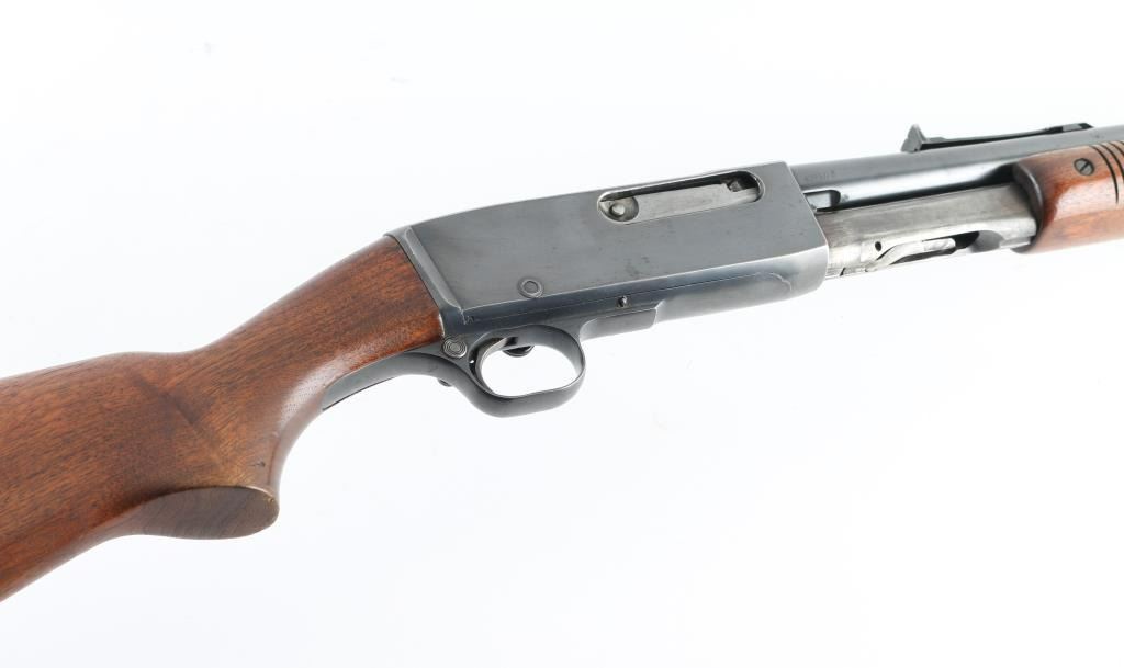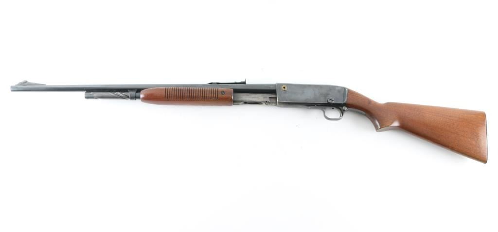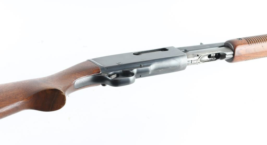 'The Gamemaster' Vintage take-down slide action repeating rifle chambered in .35 Remington, circa 1948. Features a blued finish, 24" tapered barrel, ramped dovetailed blade front sight with post, elevation adjustable rear sporting sight, 3/4 length spiral tube magazine, smooth trigger, push button safety, steel take-down receiver, grooved walnut slide handle and smooth pistol grip shoulder stock with factory knurled metal buttplate. LOP is 13.75".Bore appears excellent/bright. Metal finish is about 60% with friction wear on the magazine, handling/edge wear. A .35 REM cartridge head is inserted in left side of receiver. Wood stocks are very good with minor scratches/dings, NRA Condition-Good+ C&R Firearm.
