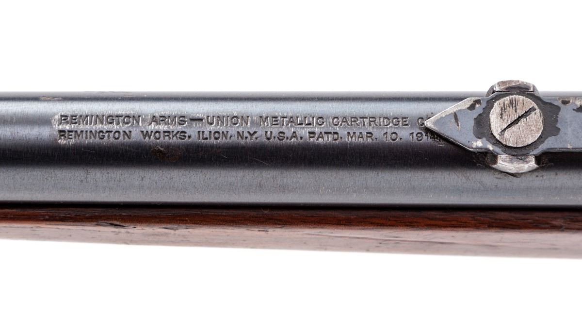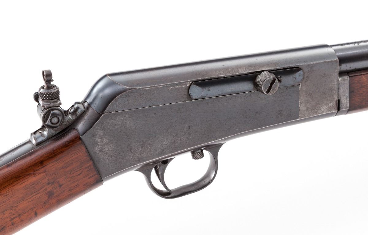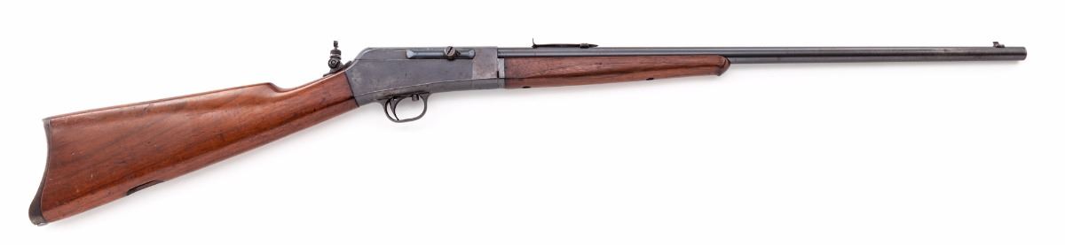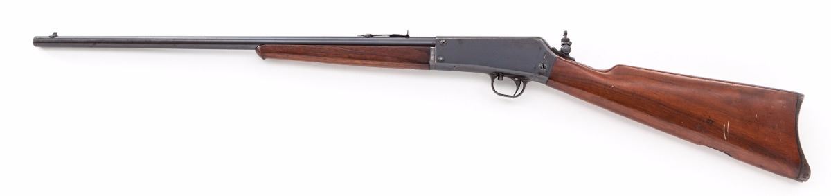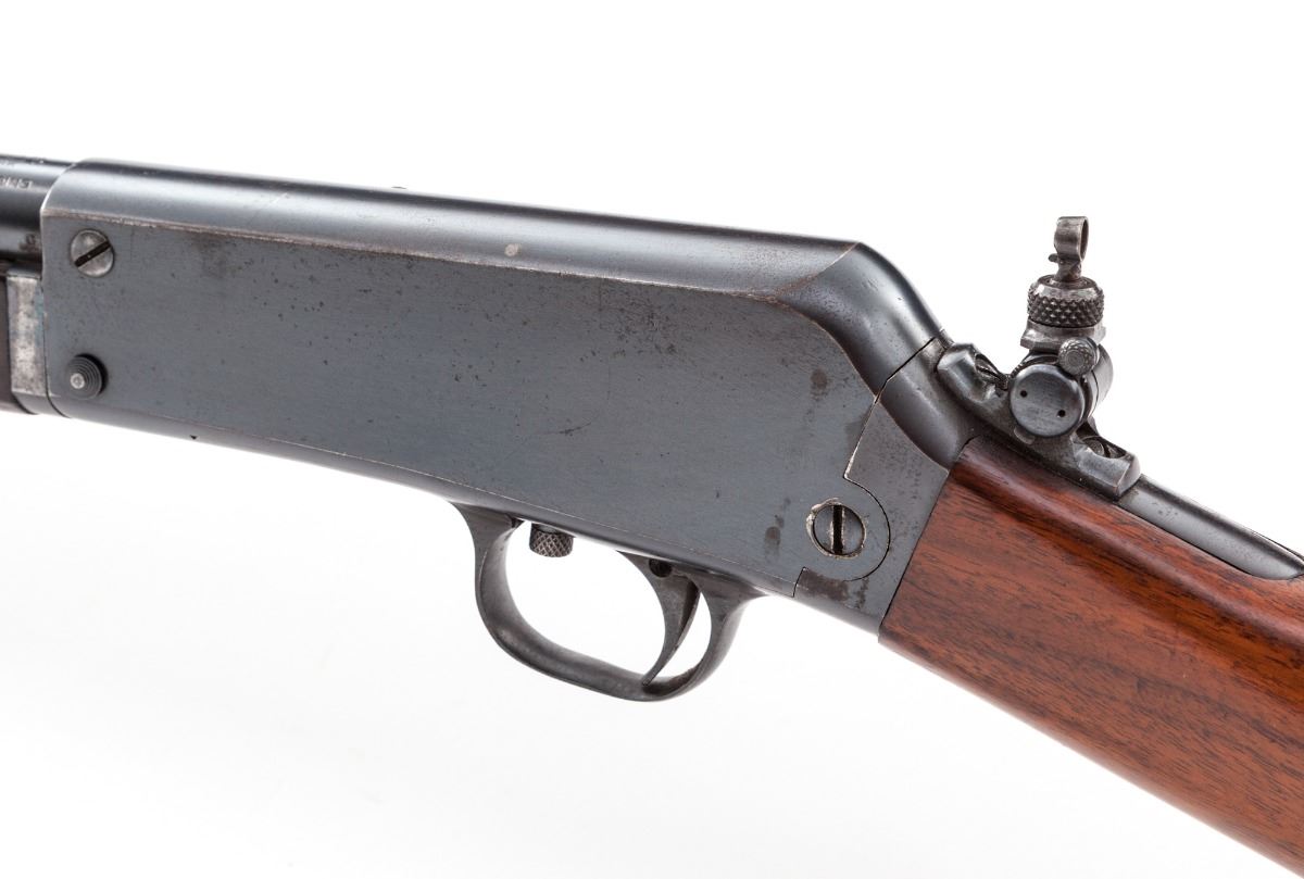 Remington Model 16 Auto-Loading Rifle, #4364, .22 Rem. Auto cal., 22'' barrel, blue finish, straight walnut stock and forend, steel Remington-UMC buttplate, dovetailed front sight, notched rear sight, and a peep tang sight. Condition is very good retaining approx. 92%-94% thinning and toning blue, with scattered fine oxidation. Stock with general bruises and impressions, as well as waffle marks near the collar. Rifle takes down and goes back together smoothly. Action remains tight, bore is good with some corrosion. Est.: $600-$900. (C&R)