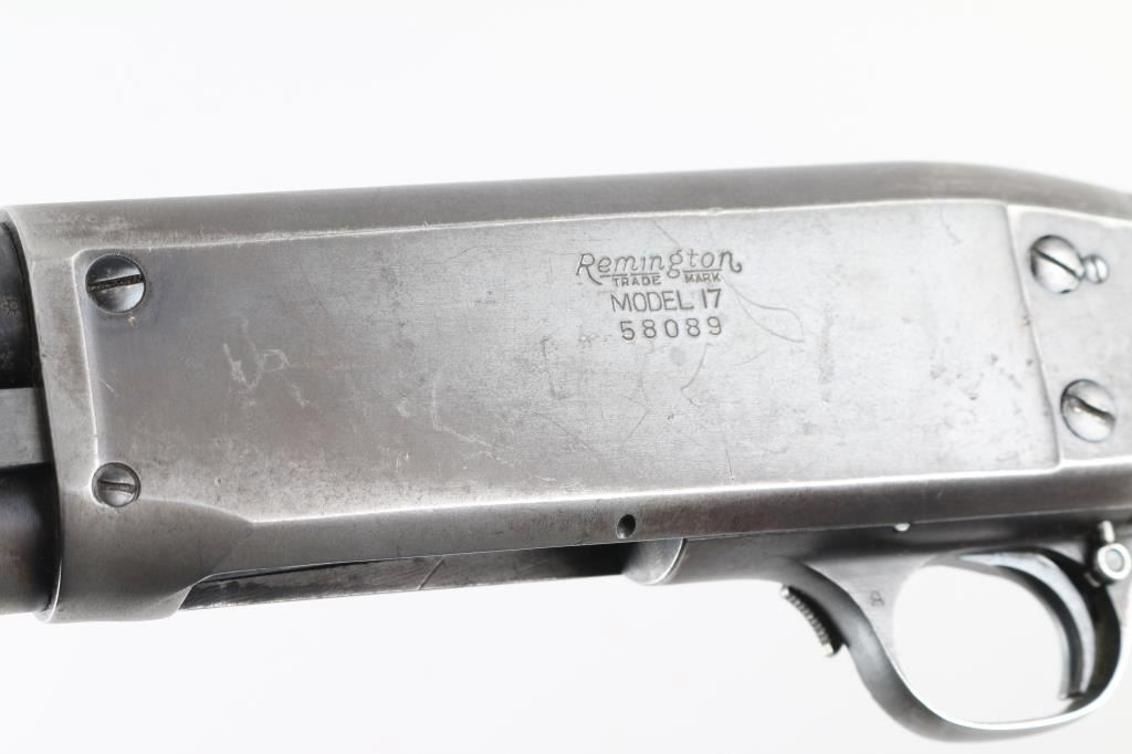 Pump action shotgun with barrel date code indicating manufacture circa 1929. Features blued finish, grooved wood pump handle, smooth wood semi-pistol grip shoulder stock, grooved hard rubber buttplate, pushbutton safety, solid receiver with bottom ejection, 30" plain barrel, Full choke, steel bead front sight. Bore is good condition, might improve with a good cleaning. Retains 40% finish, most retained dark color is on barrel, with discoloration and patina on receiver, wear areas from moving parts, edge losses. Wood is very good overall with scratches and some finish loss. Barrel numbered to frame. Markings are crisp. Screw slots show marring. Condition is NRA Good++ *** C&R Firearm ***
